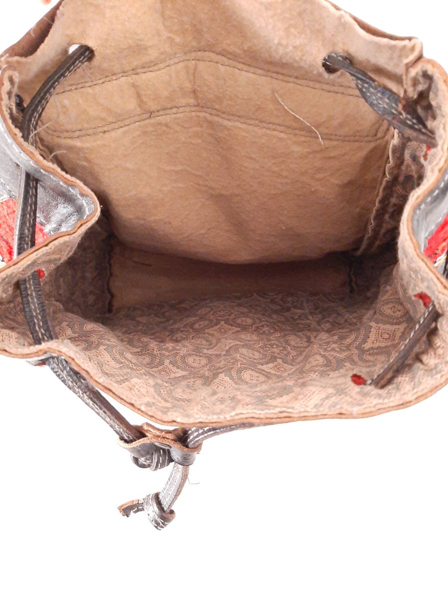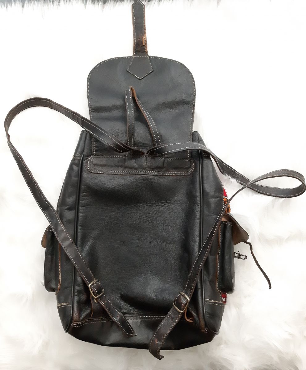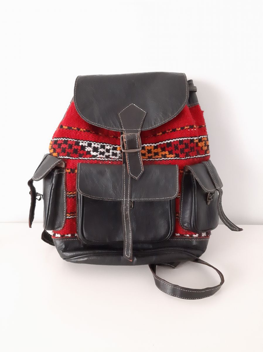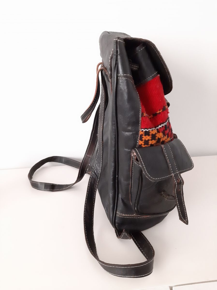 Sac berbère en cuir noir et tissu tissé rouge crée à la main.dimensions hauteur 40cm largeur 35cm. 3 poches extérieures. Cuir abimé sur le bandeau de fermeture, voir photo