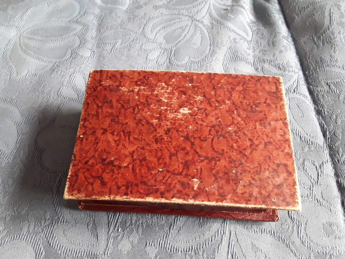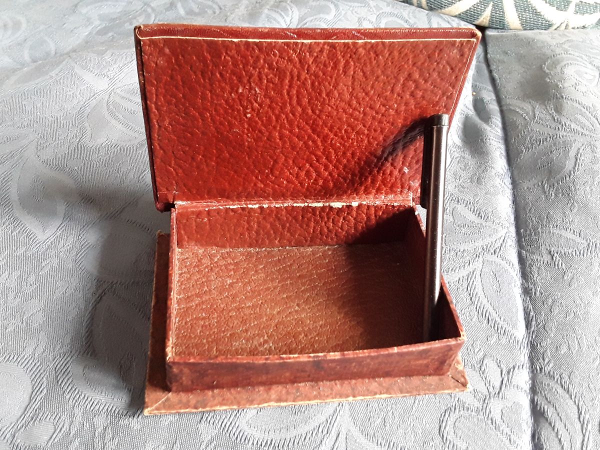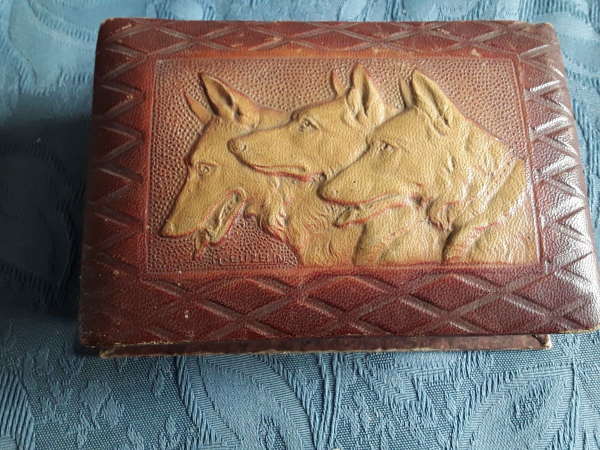 Boite en carton et cuir repoussé illustrée de trois têtes de chiens berger signée M.Buzelin