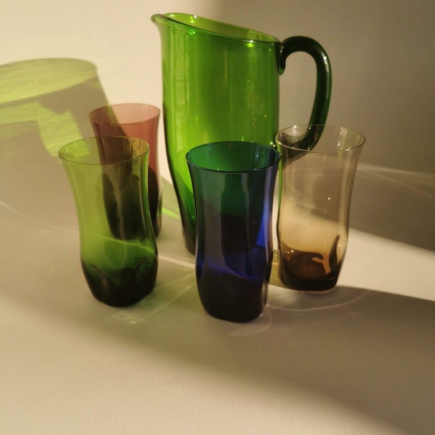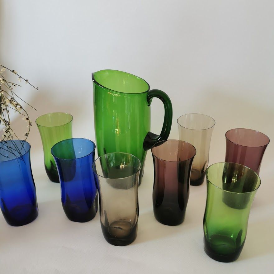 Très beau service composé de 8 verres et une carafe. Verres colorés. Parfait état de conservation. Verre très fin.
