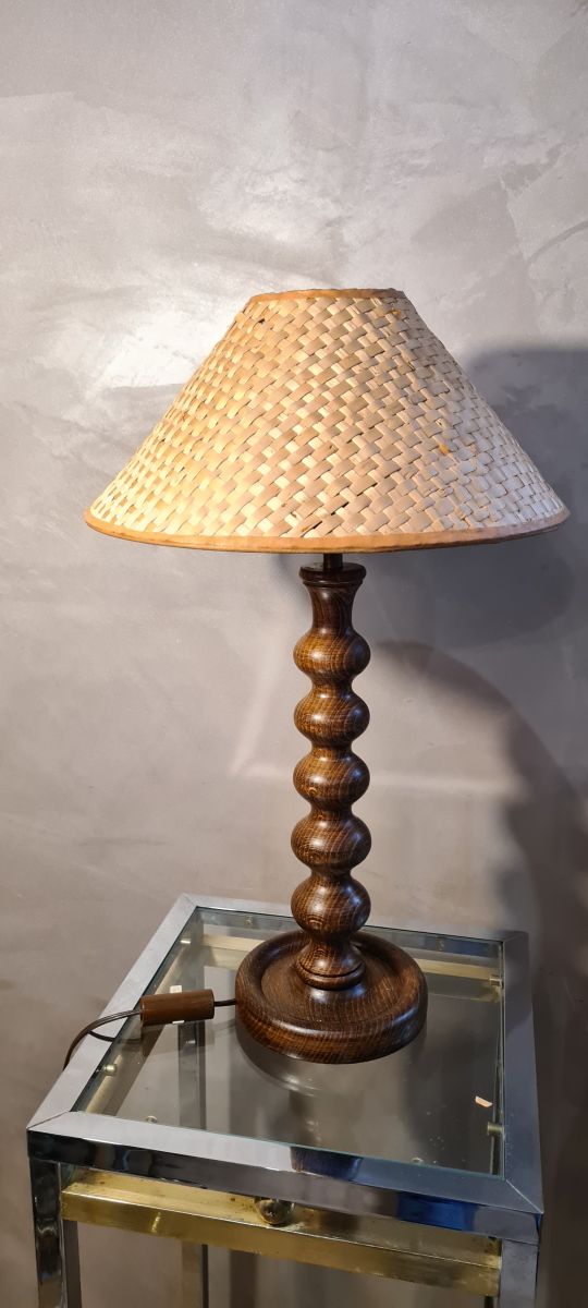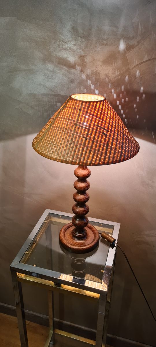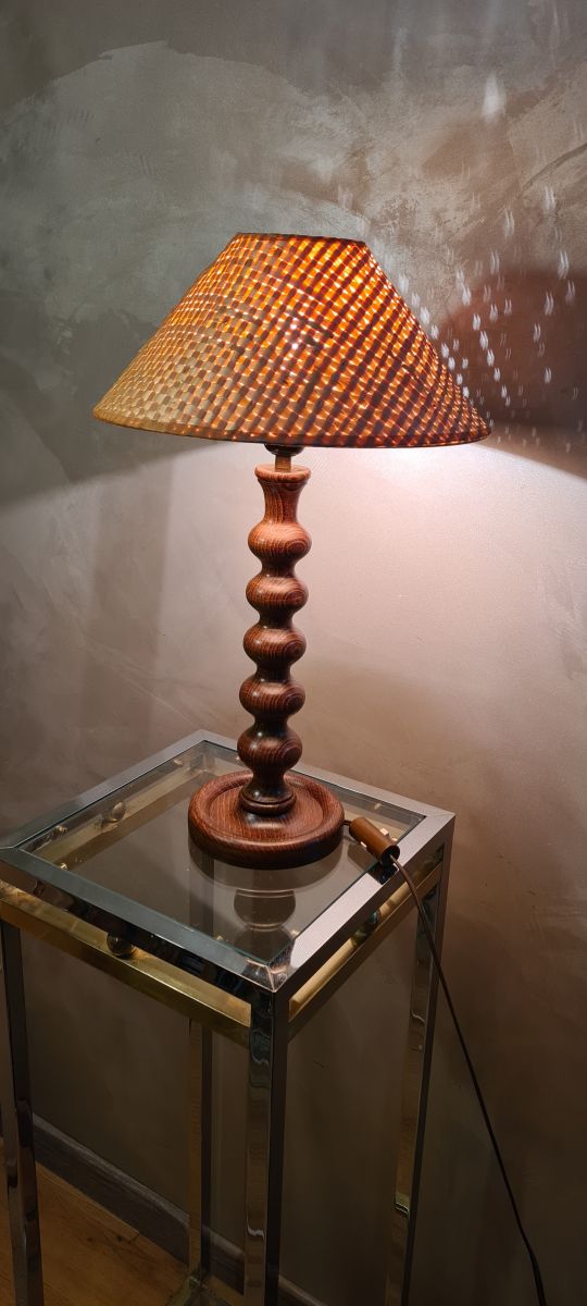 lampe bois tourné avec veinage marquer et abat jour rotin 19