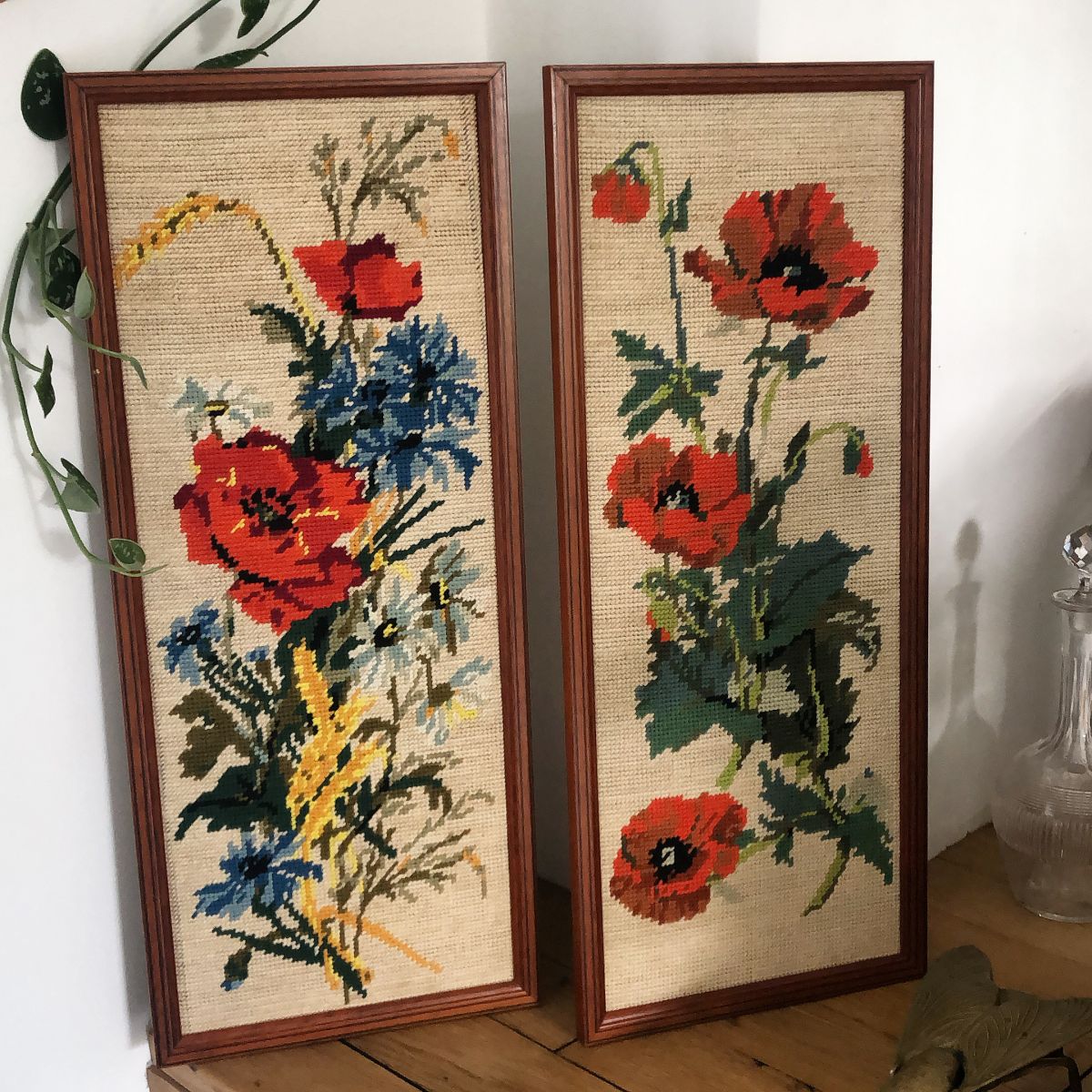 Joli duo de cadres canevas vintage , motifs fleurs des champs et coquelicots en très bon état .