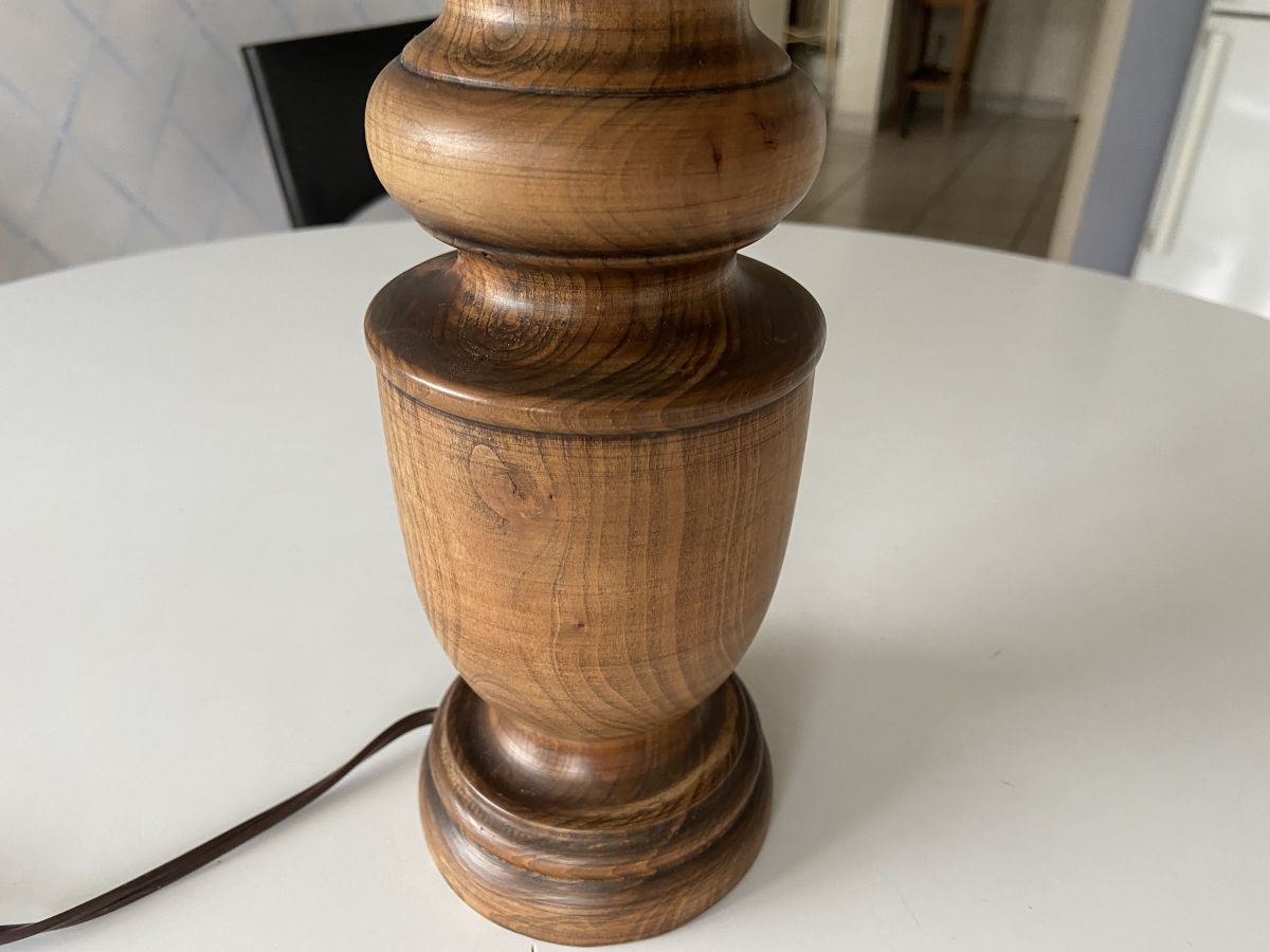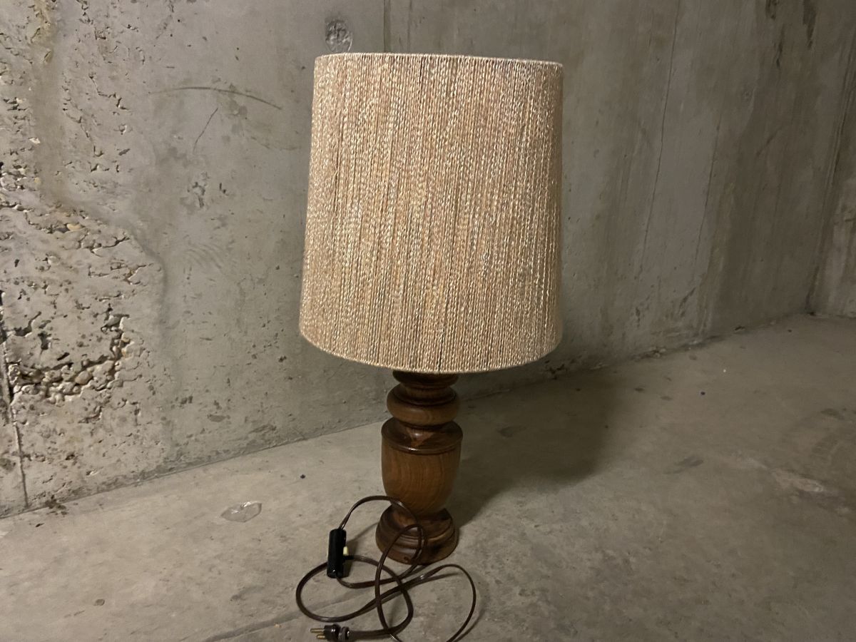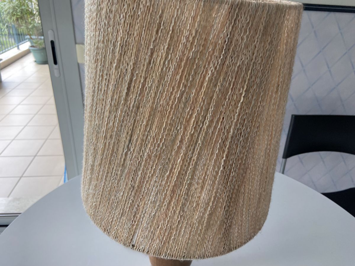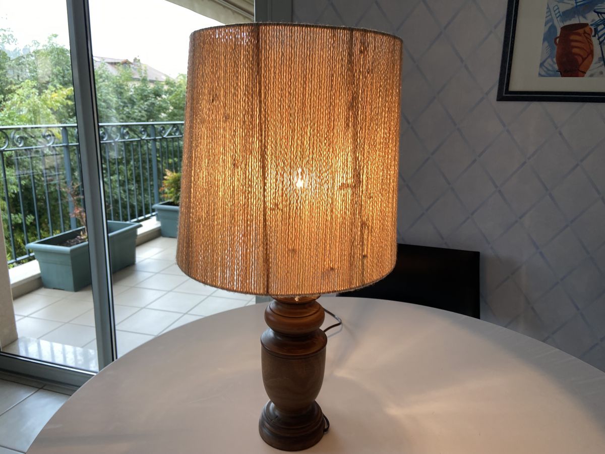 Lampe à poser des années 70 en bois tourné, abat-jour en fil de laine, hauteur totale 56cm, diamètre de l’abat-jour 30cm, diamètre du pied 10cm, bon état.