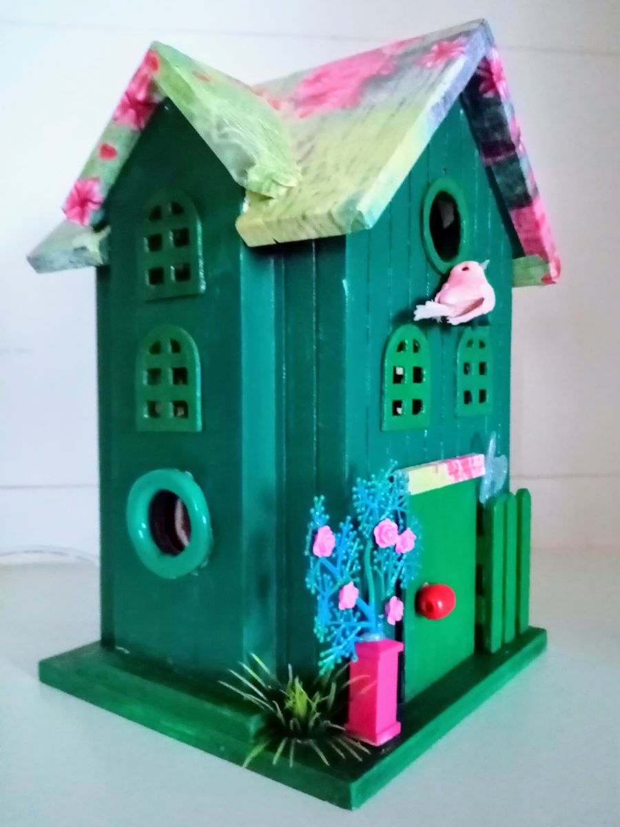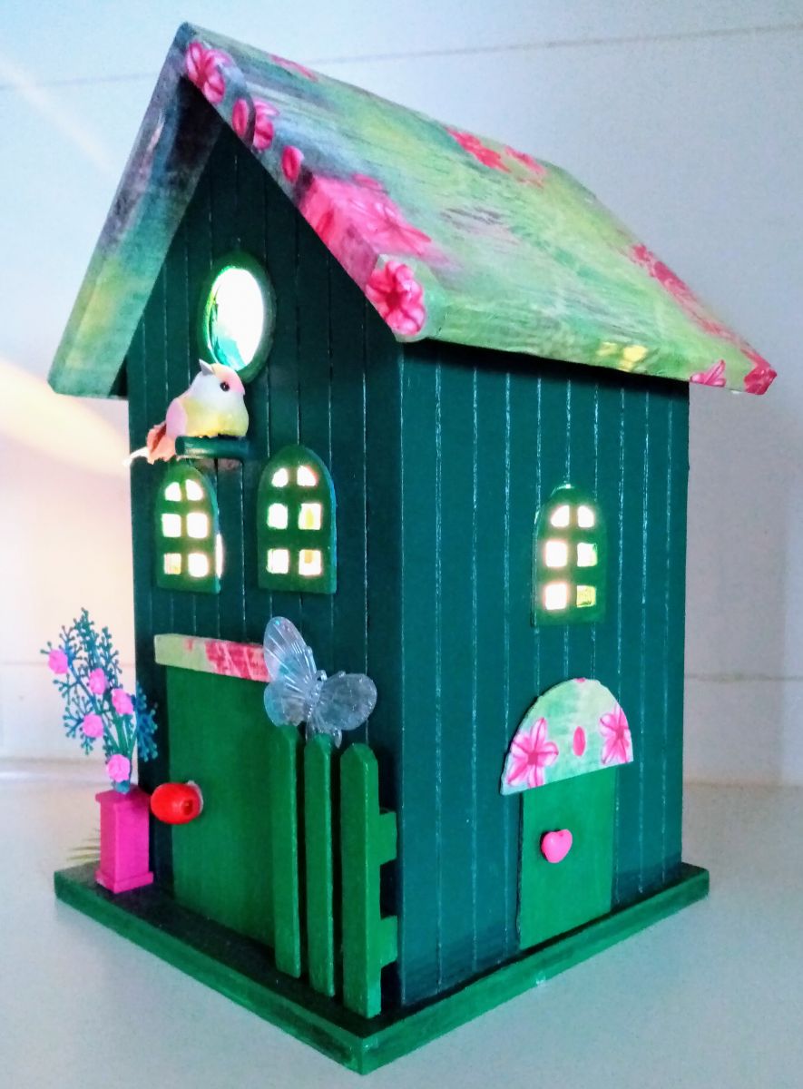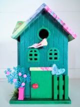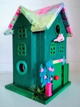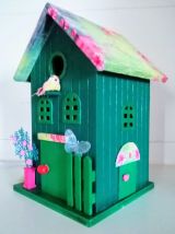 ICI: Lampe de chevet nichoir en bois vert à détails colorés et à châssis verts. Cette maison d'oiseau est un joli luminaire dont les 7 fenêtres sont des ouvertures qui éclaireront votre intérieur ou la chambre de votre enfant et en font une véritable lampe de chevet.