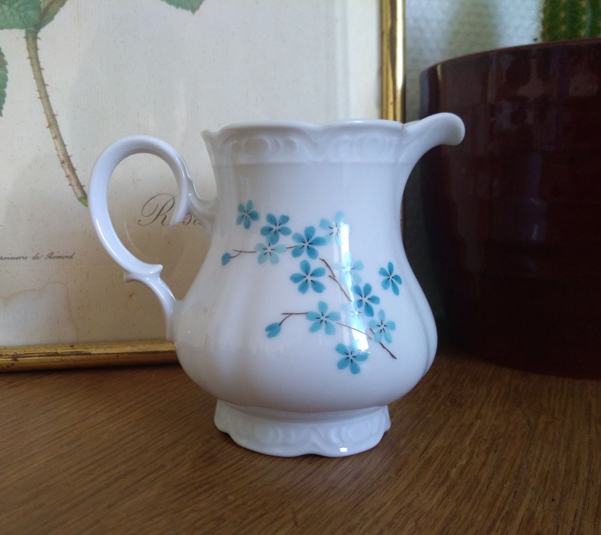 Petit pichet en porcelaine et aux motifs myosotis bleus. La mention EuroPorcelaine ainsi qu'un numéro sont inscrits en dessous.