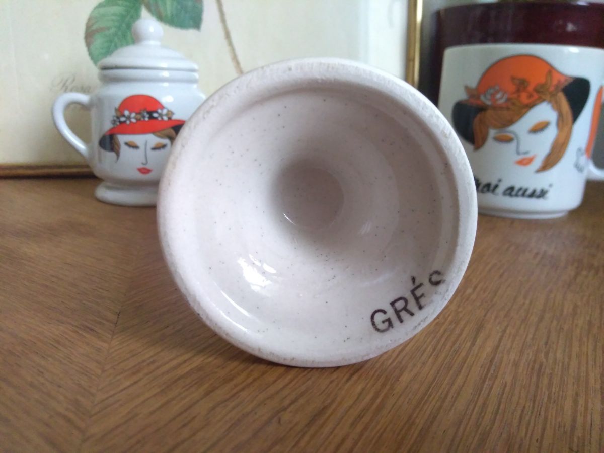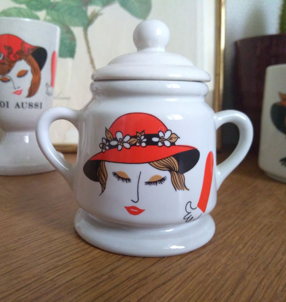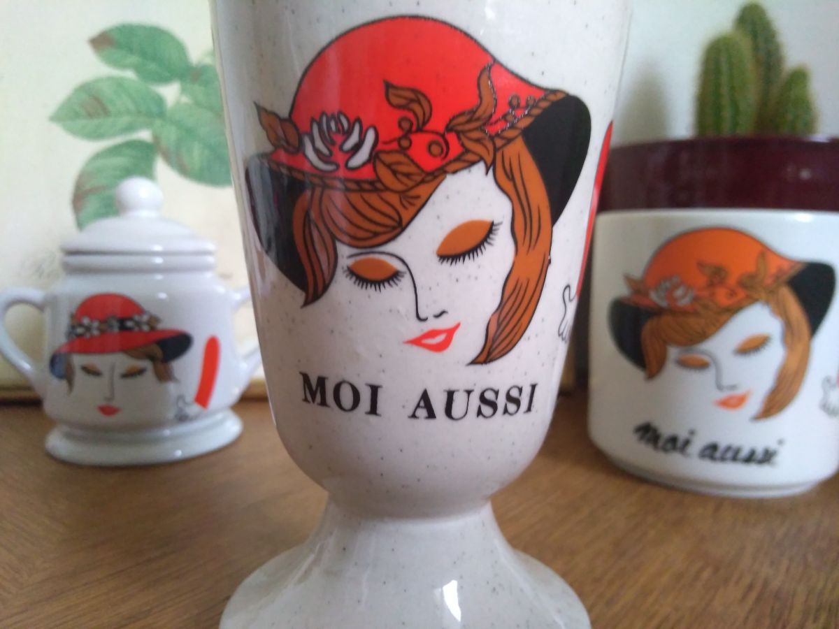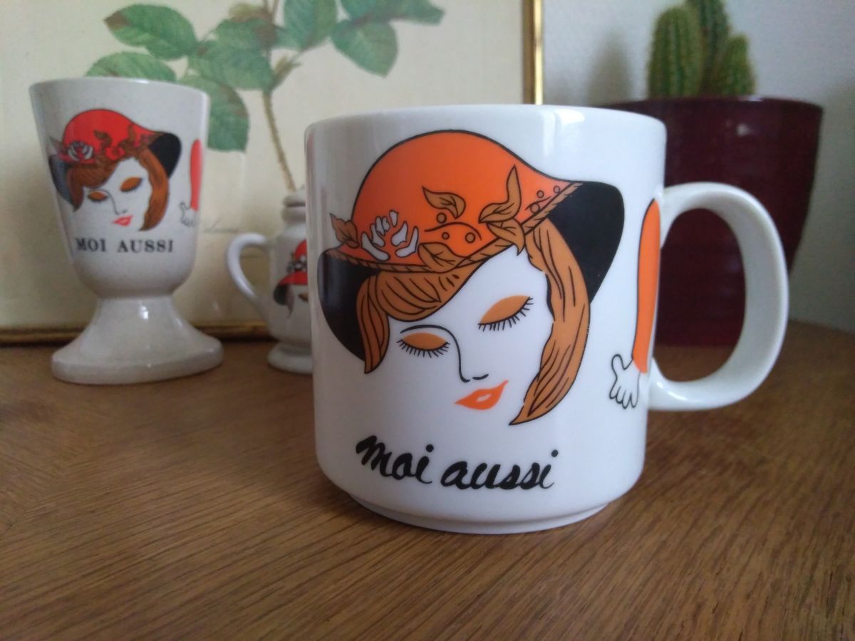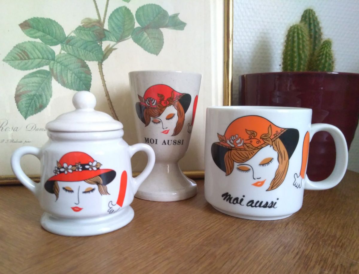 Ensemble de 2 tasses et d'un petit pot Vintage, au décor féminin "Moi Aussi". La mention GC Décor déposé est inscrite sous la tasse et la mention grès est inscrite sous le masagran.