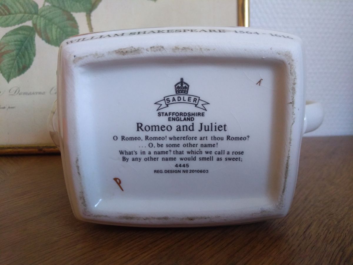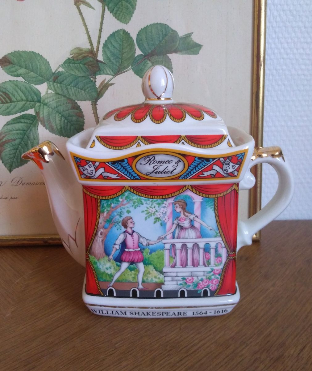 Théière Sadler Vintage, en porcelaine, avec son couvercle et sur le thème de Roméo et Juliette de Shakespeare. La mention Sadler Staffordshire England Romeo and Juliet est inscrite en dessous, ainsi qu'une citation en Anglais de la pièce.