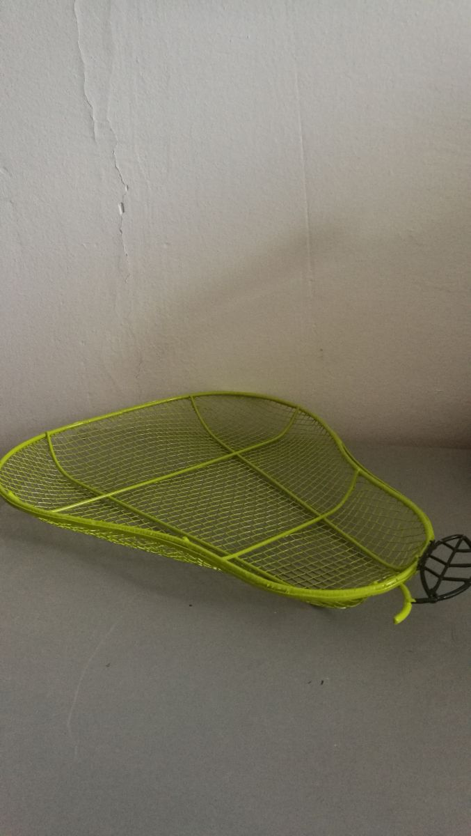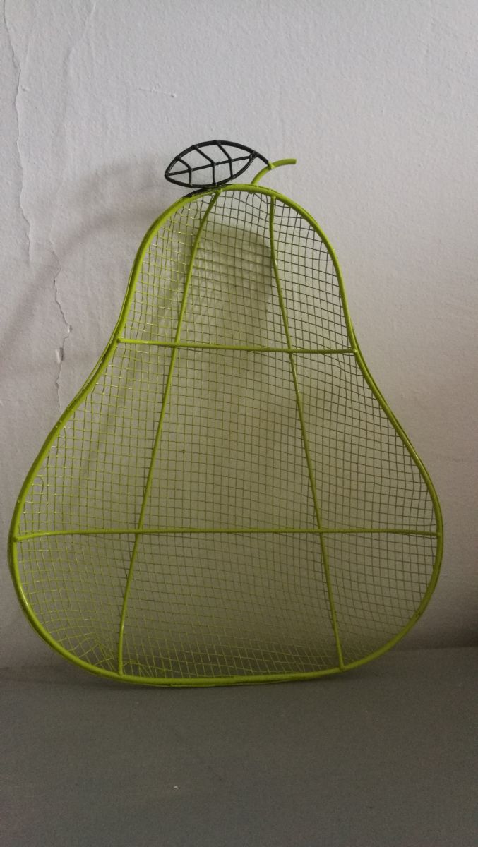 Corbeille à fruits en grillage métallique coloré en forme de poire.