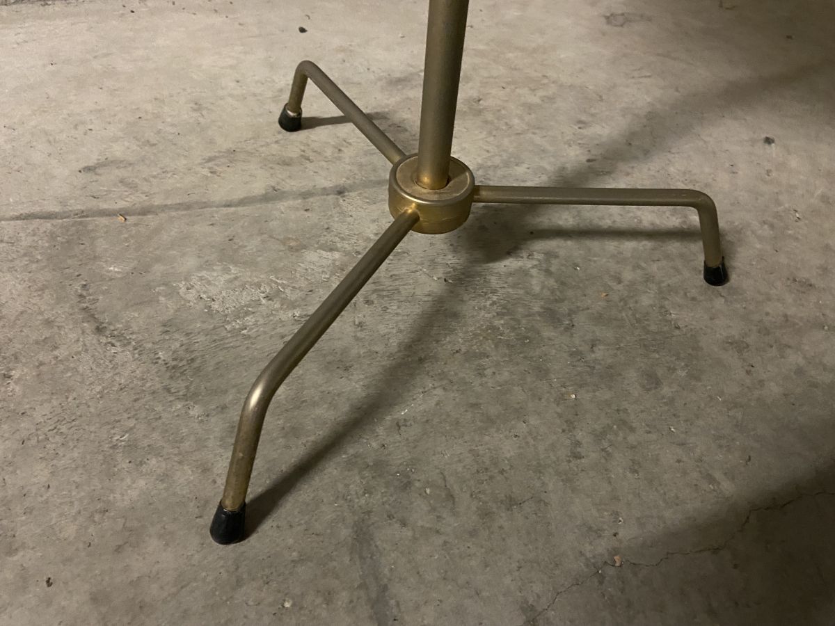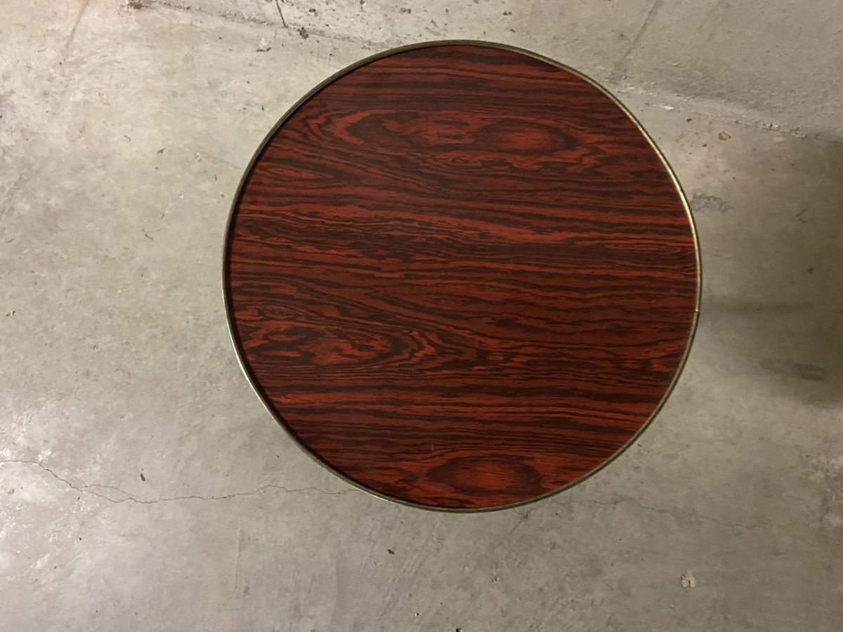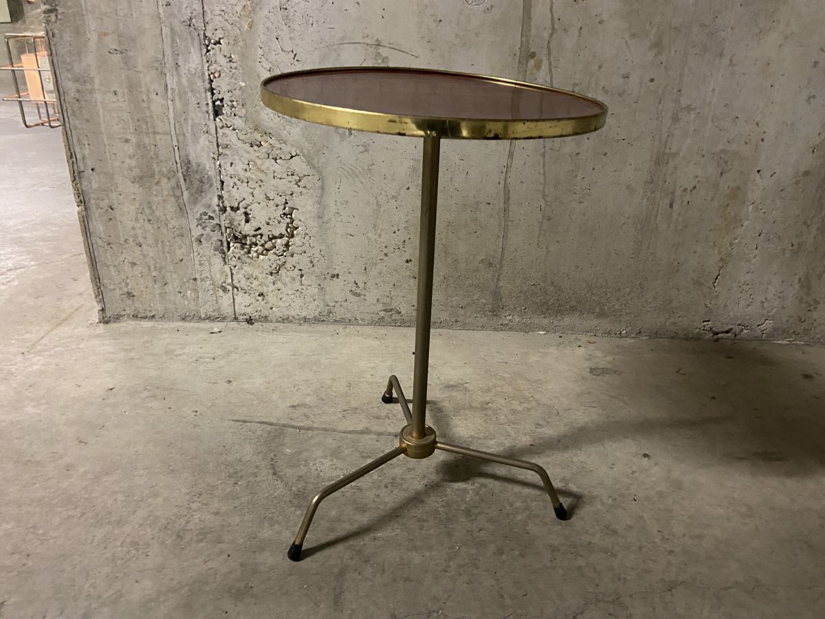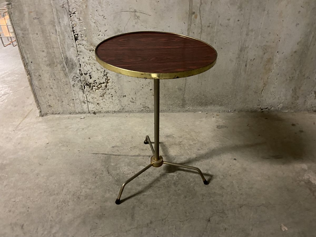 Petit guéridon en métal des années 50, laiton et plateau en formica imitation bois, quelques piqûres et traces du temps lui conférant tout son charme (voir photos), hauteur 52cm, diamètre plateau 34cm.