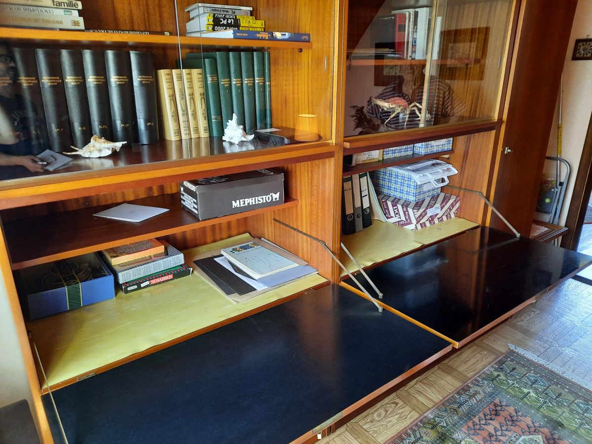 Deuxième placard: Partie haute avec portes L 1,50m x l 0,63m x h 0.60m. Partie basse avec vitres coulissantes en verre, 1 rabat faisant office de plan de travail, 4 tiroirs et 1 penderie L 1,50m x 0,63m x h 1,83m