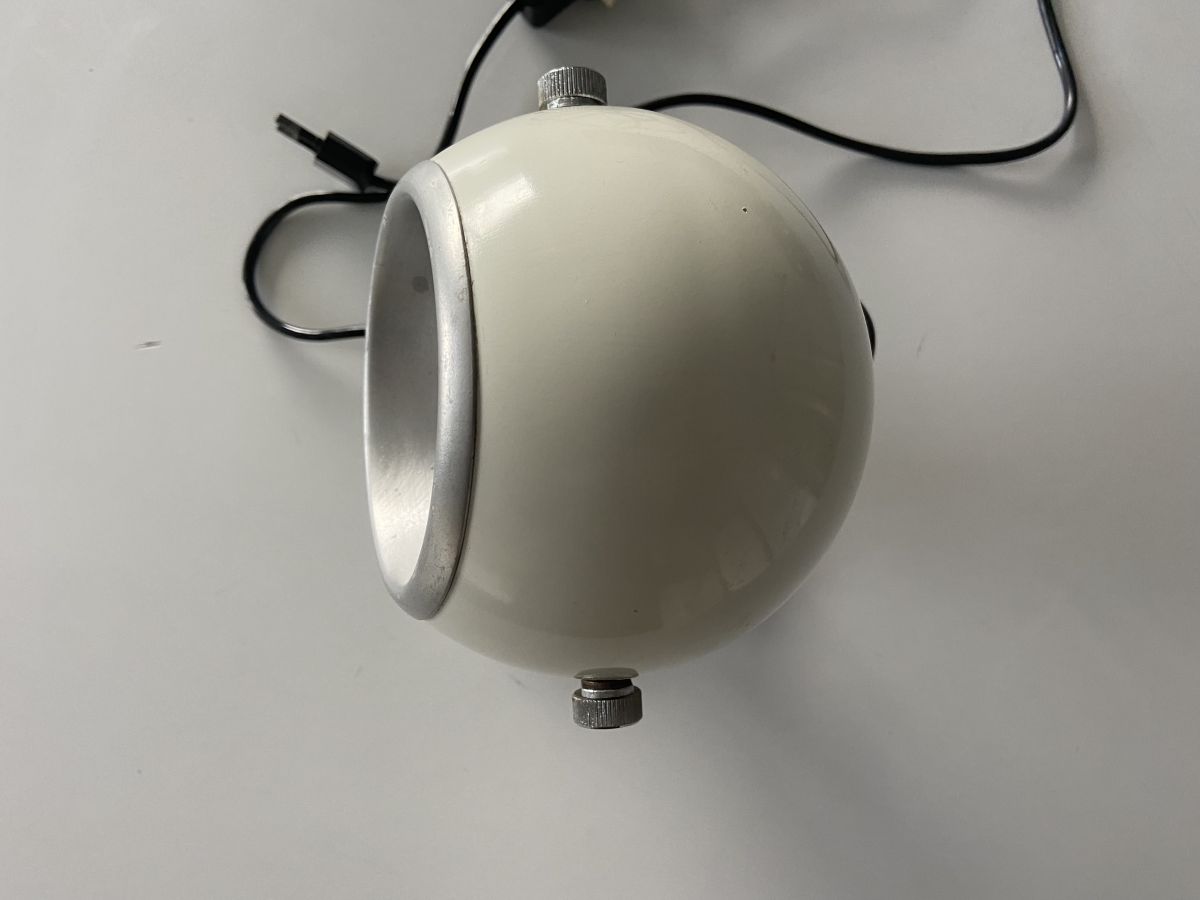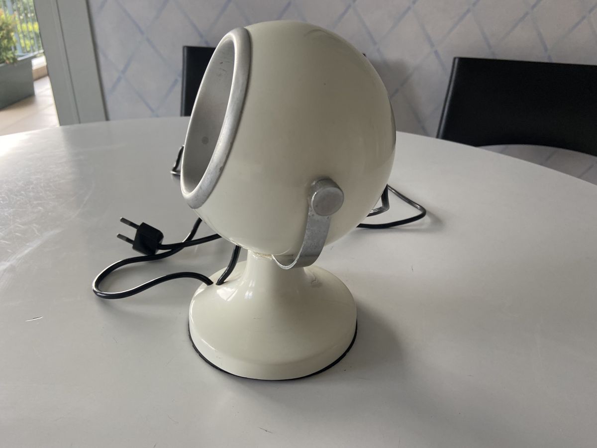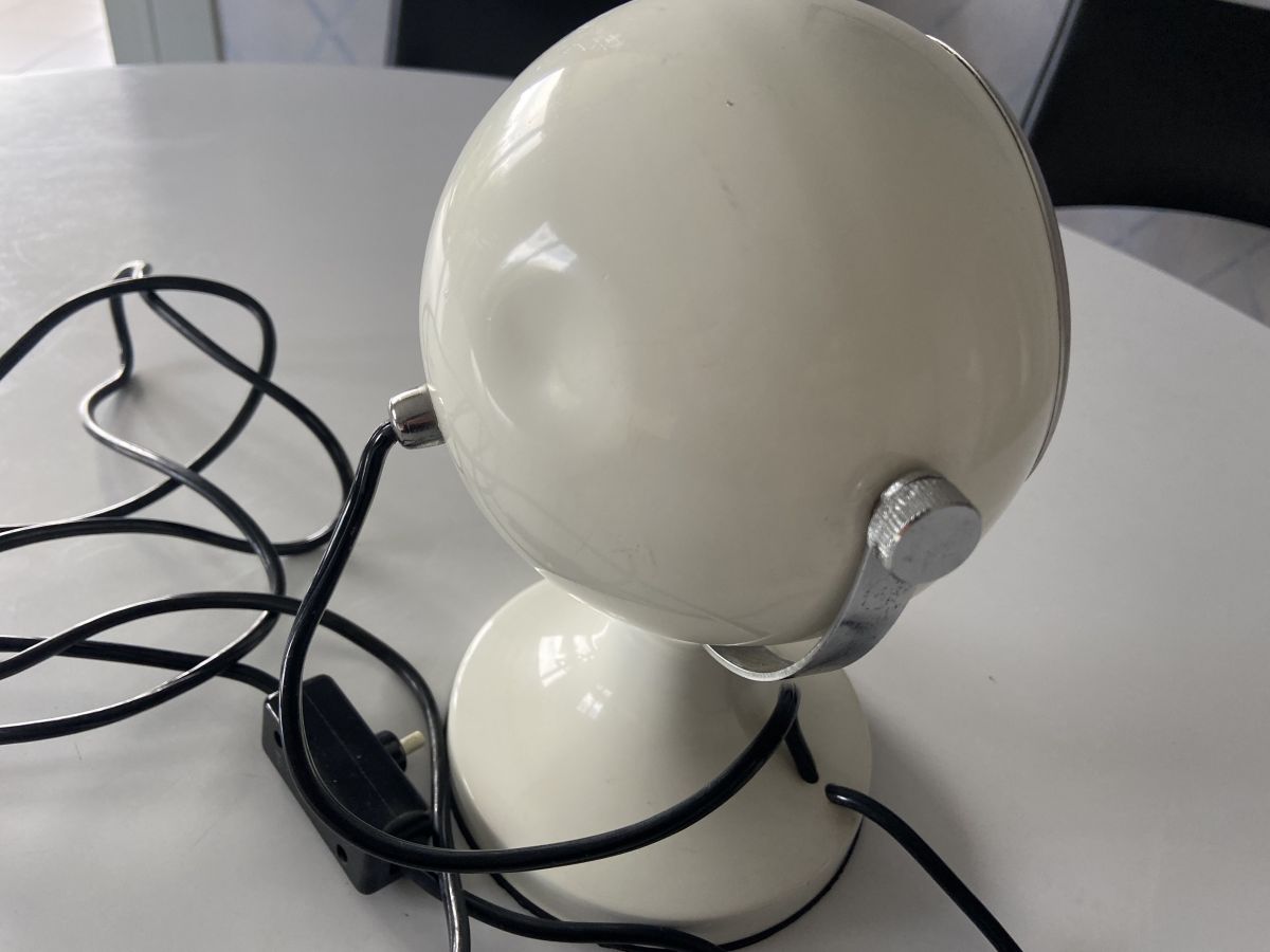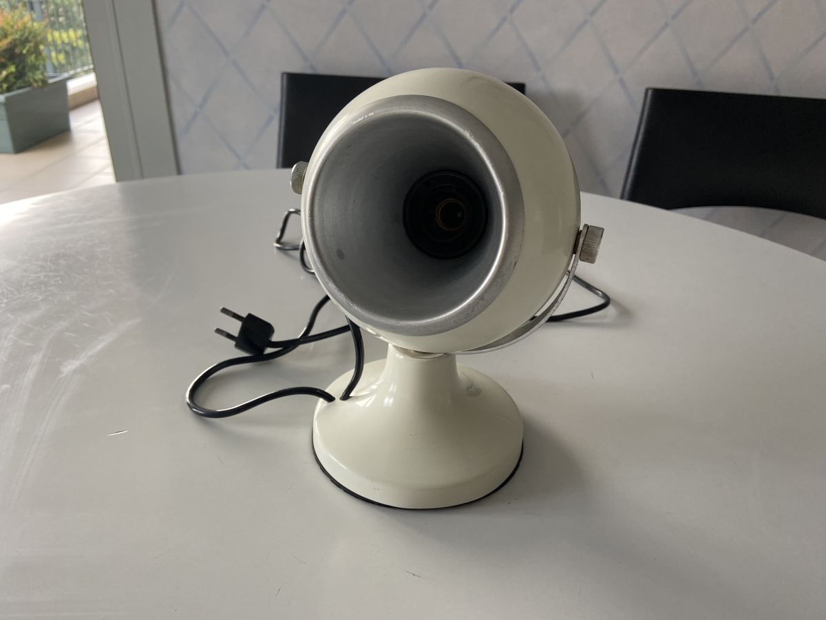 Petite lampe « eyeball » à poser des années 70 en métal, de couleur blanche, interrupteur à poussoir, un poc sur le globe sans conséquence (voir photos), hauteur 20cm, diamètre socle 12cm, diamètre globe 13cm, ampoule à vis type E14, fonctionne parfaitement.