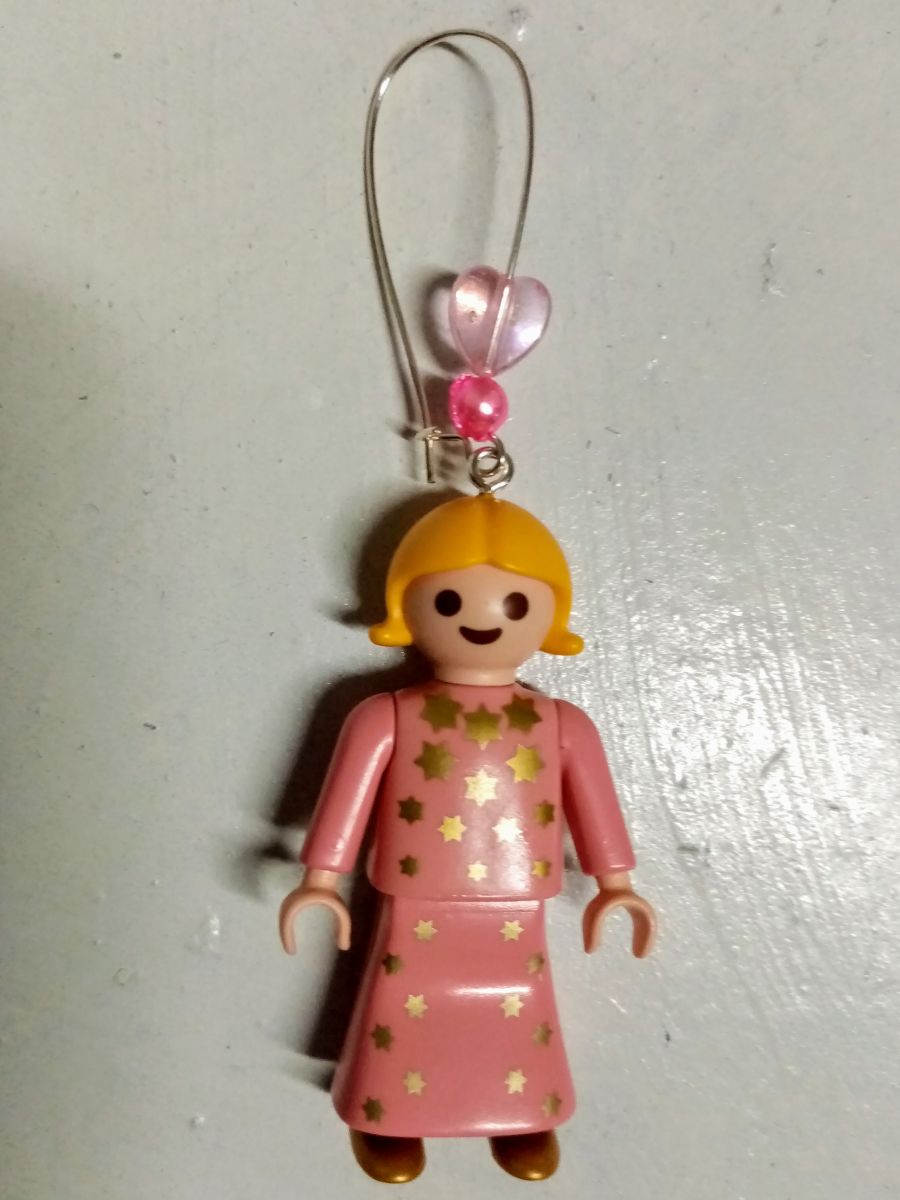 - figurine Playmobil de petite fille aux cheveux blonds, habillée d'une robe rose à étoiles féériques/perles roses nacrées + perles cœur rose translucides
