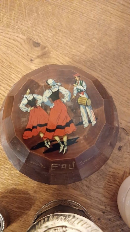 n°4 Boîte ancienne en bois souvenir de Pau avec décor danse folklorique pays basque. Gravure Pau sur le couvercle. Attention > manque une partie de la tête d'une danseuse sur le couvercle. Voir photo.