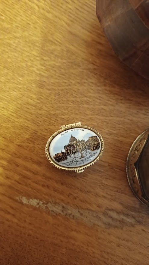 n°3 boîte ovale à pilules fer blanc gravé sur les côtés et décor céramique souvenir d'italie Roma S.Pietro sur le couvercle.