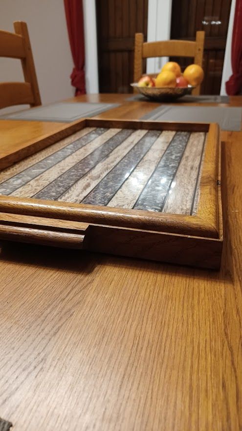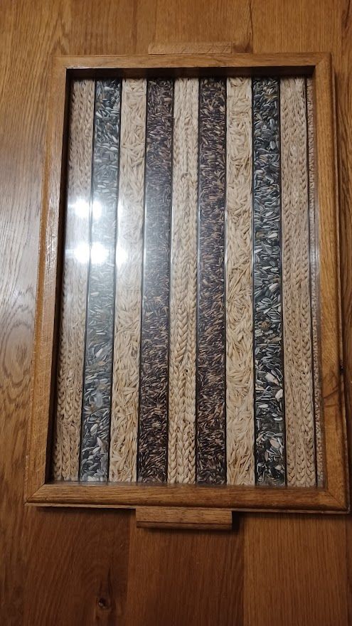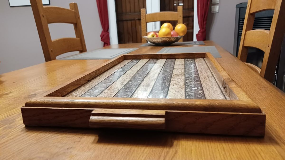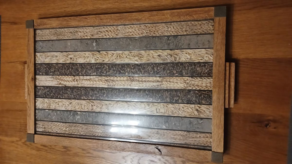 Joli plateau de service vintage en noyer avec le fond en décor céréales naturelles insérées dans du plexi transparent. Très original.