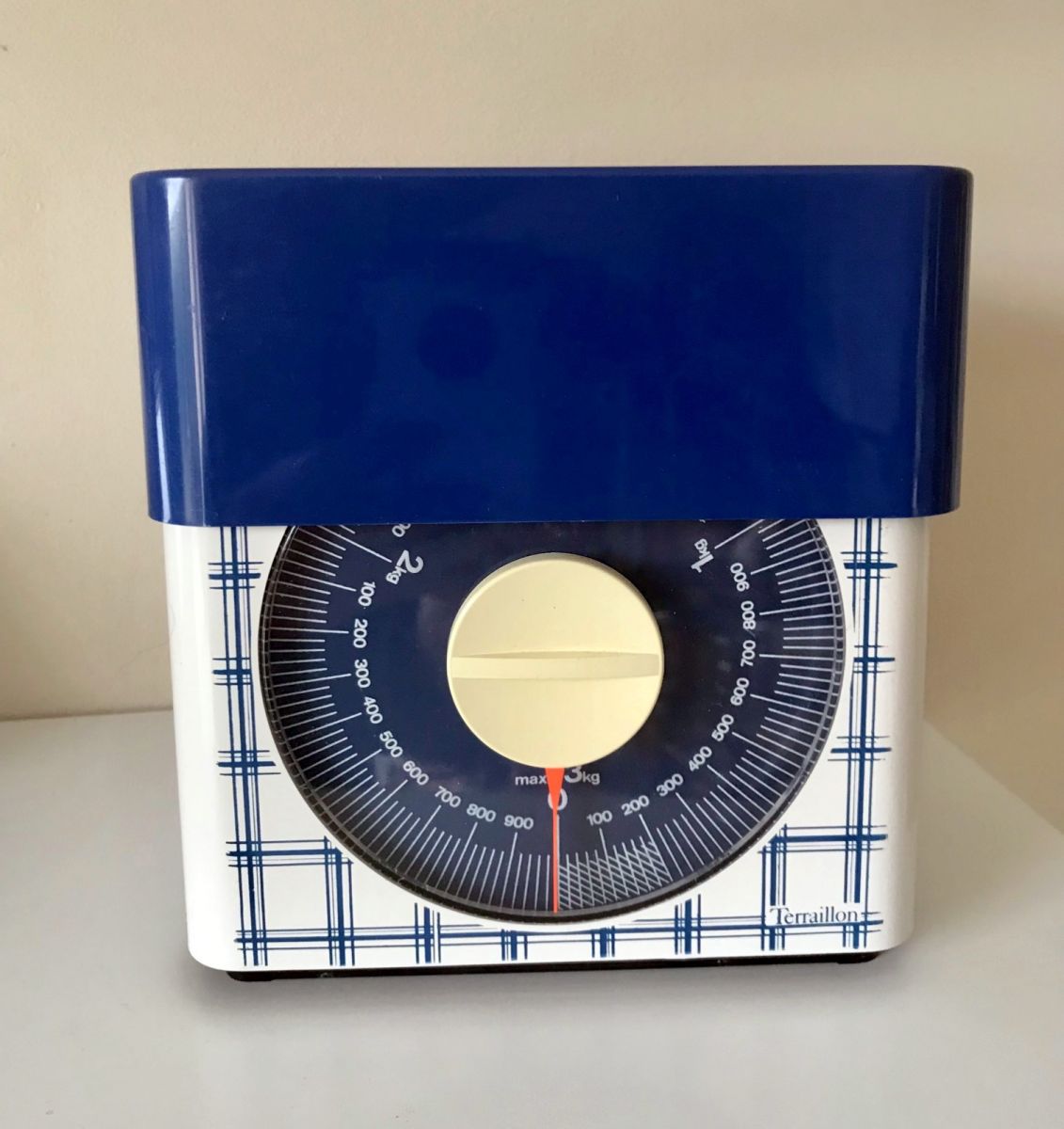 Très jolie balance Terraillon des années 70 en très bon état, le motif n'est pas jauni, juste d'infimes traces d'usage sur le contenant (voir photos). Beaucoup de charme dans une cuisine ! Max. 3kg