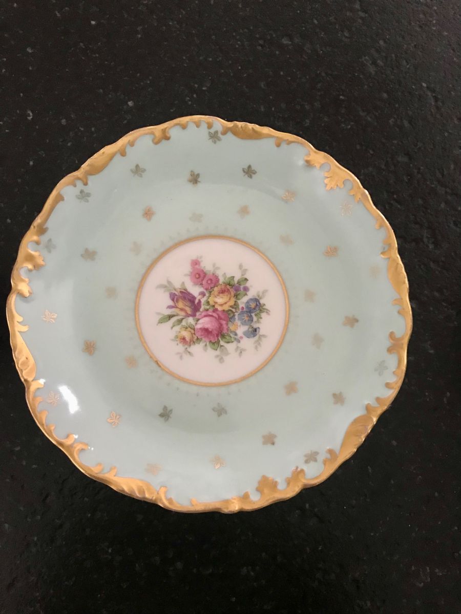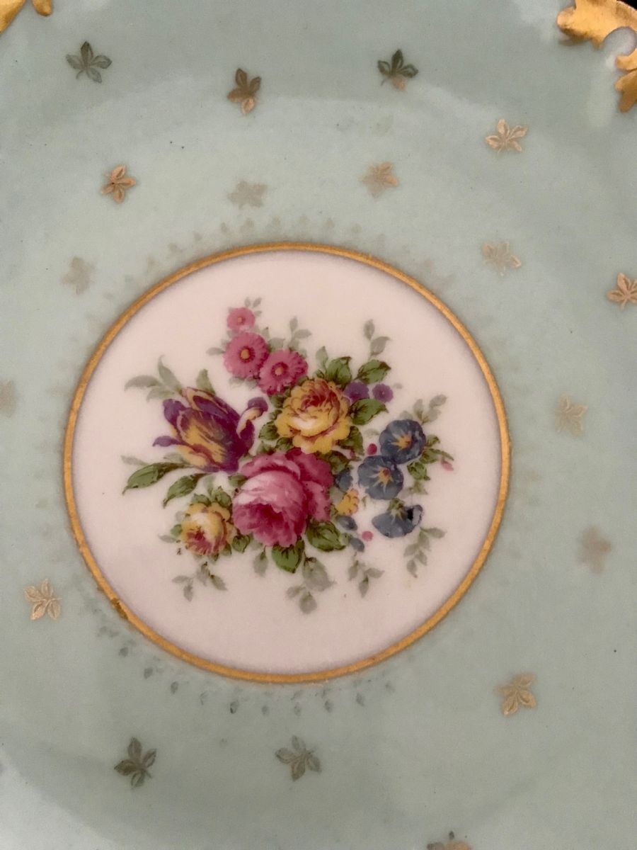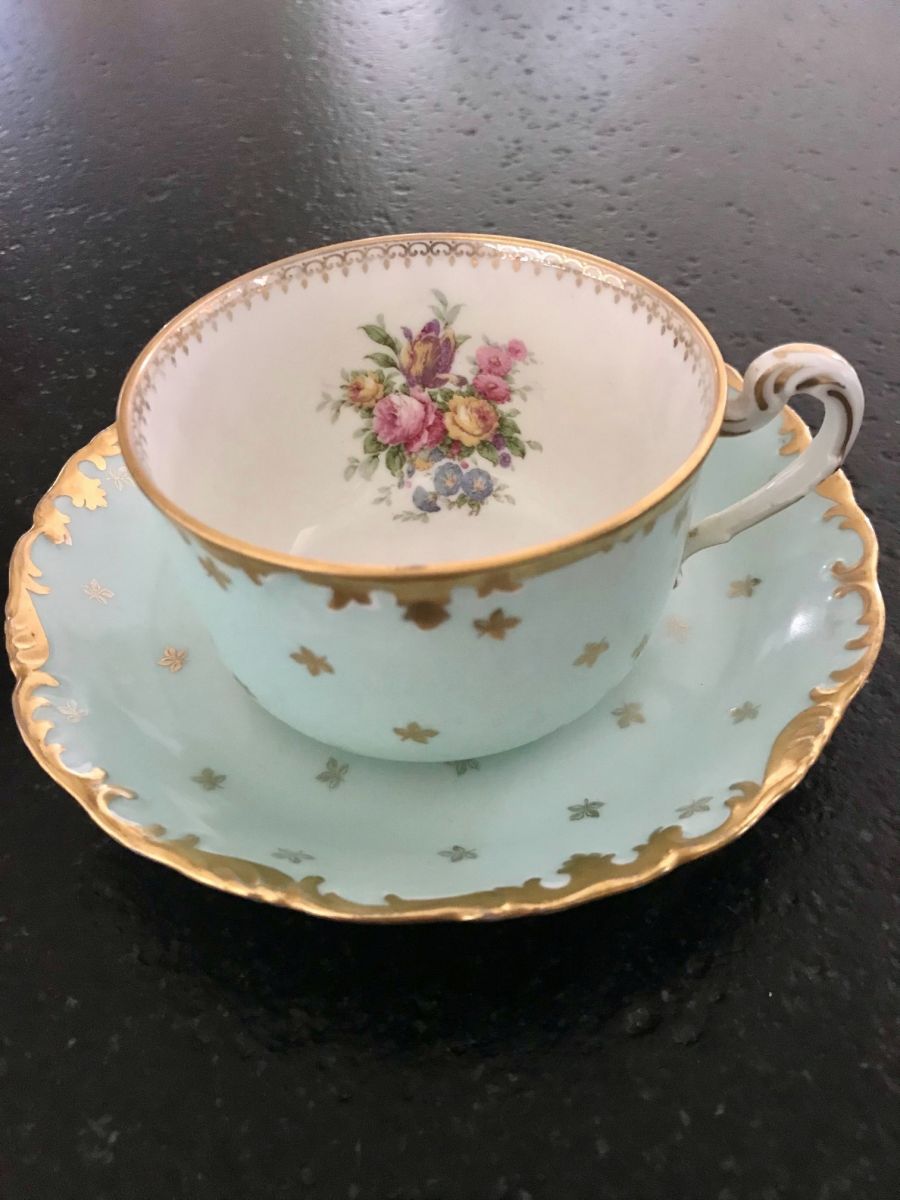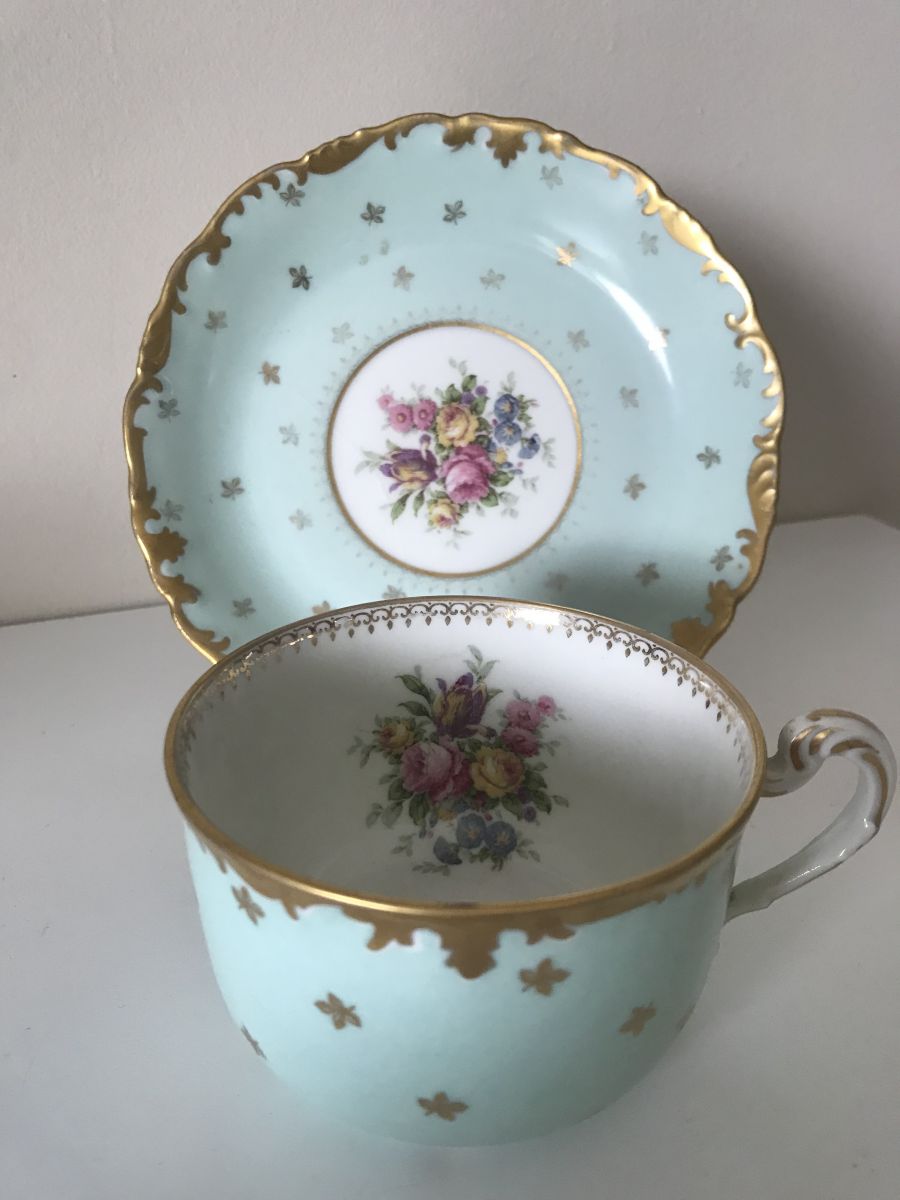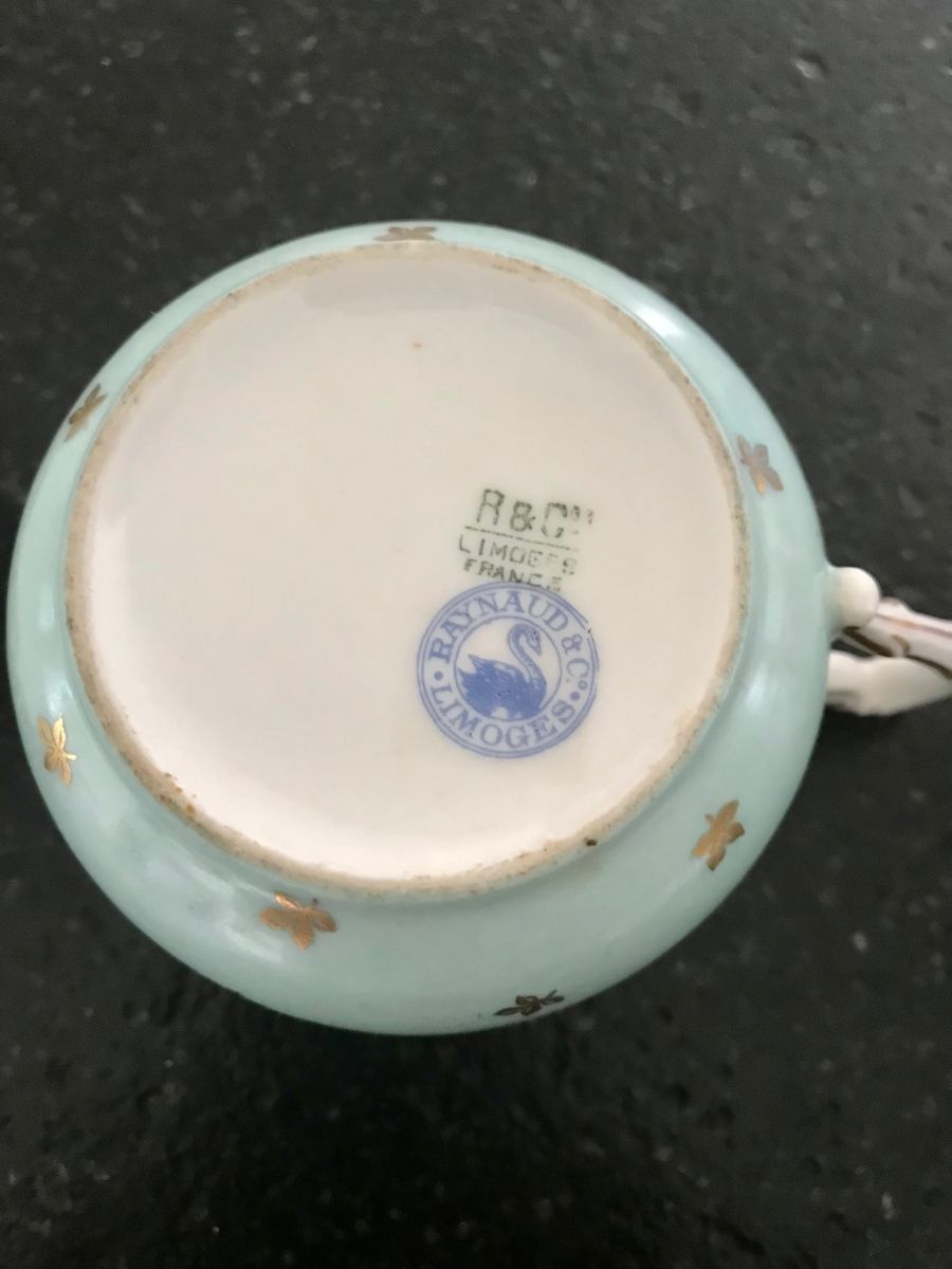 Très jolie tasse ancienne en porcelaine de Limoges, Raynaud (années 1940), les couleurs et la dorures sont très bien conservées, pas de fêle ni de manque, cheveu à l'envers de la sous-tasse.
