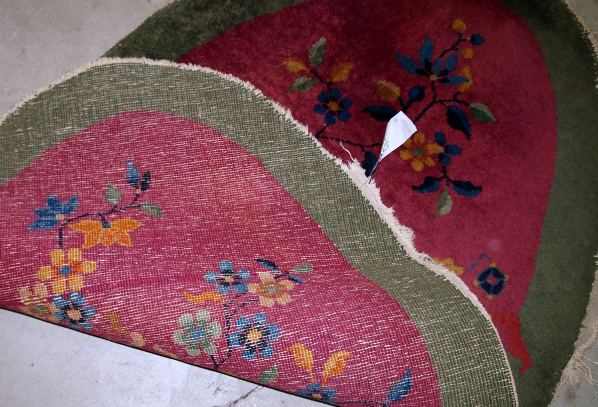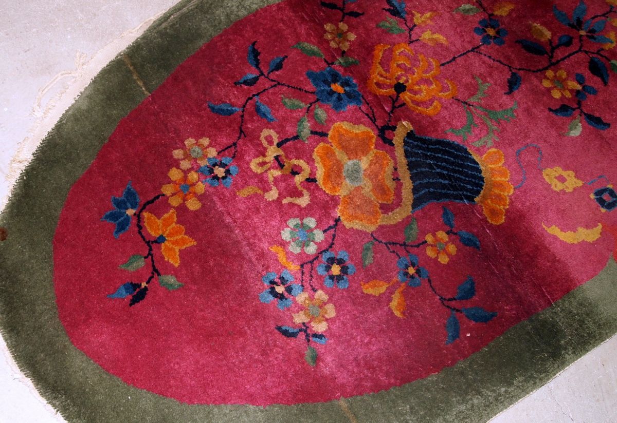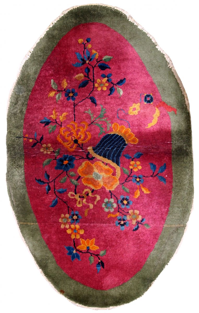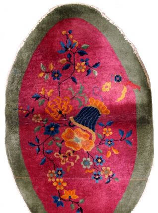 Handmade antique oval decorative rug from China in original good condition. The rug is in fuchsia and green shades.