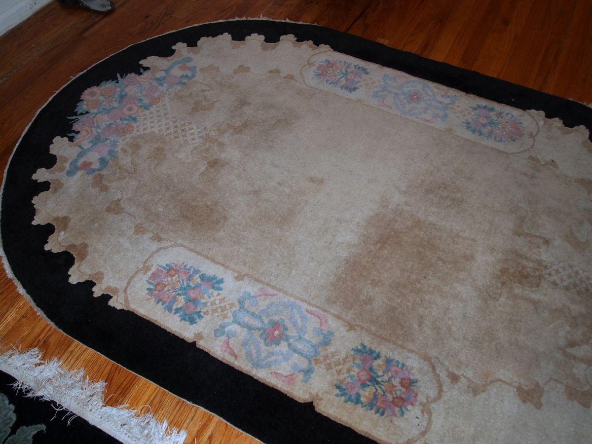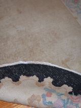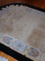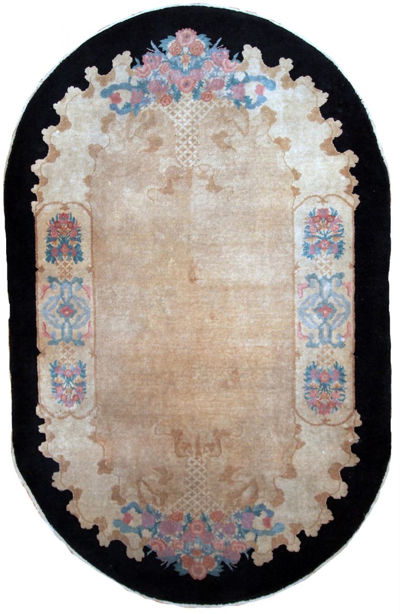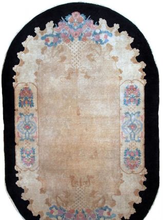 Handmade antique oval Art Deco Chinese rug in light brown shade with black border. The rug is in original good condition.