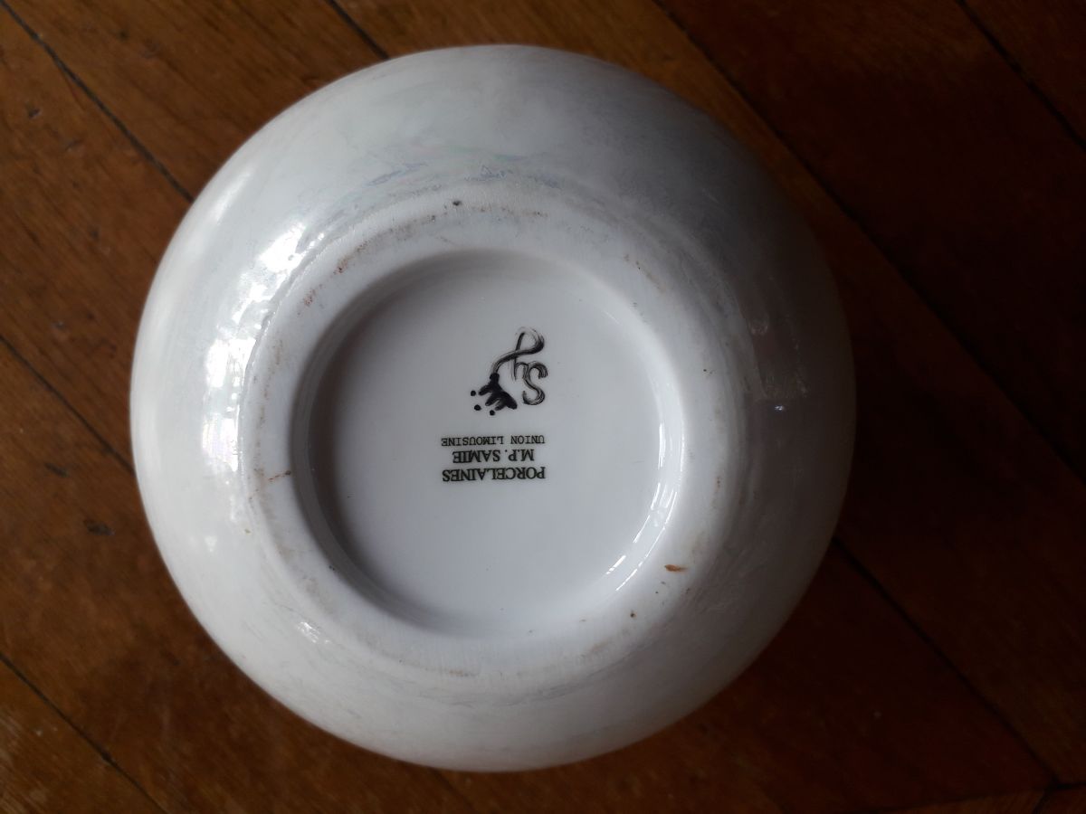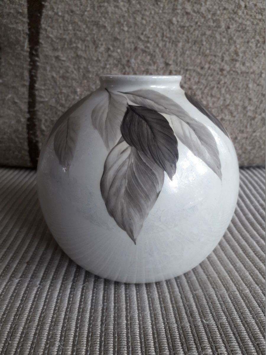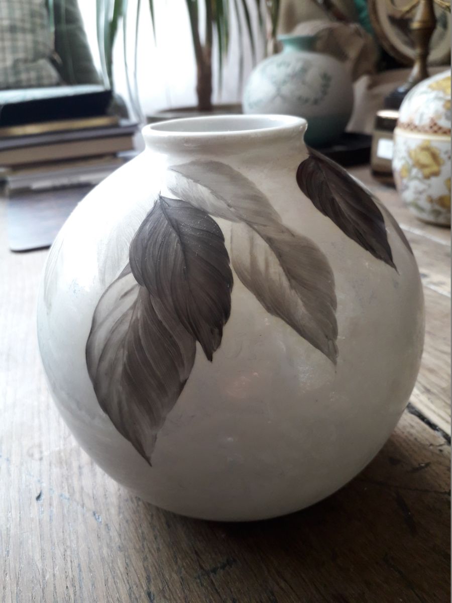 Vase vintage rond en céramique blanche et avec un décor végétal dans les tons gris. Le vase est signé des porcelaines MP Samies de l'Union Limousine.