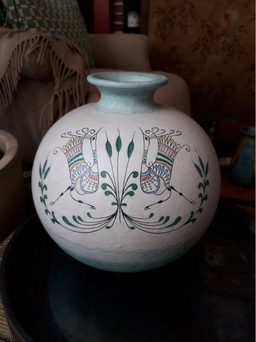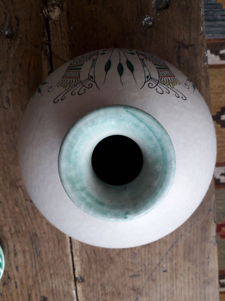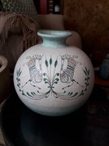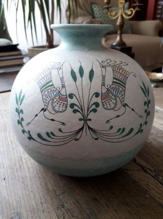 Vase rond très original en céramique italienne signé . Le décor représente des oiseaux dans un style naif.