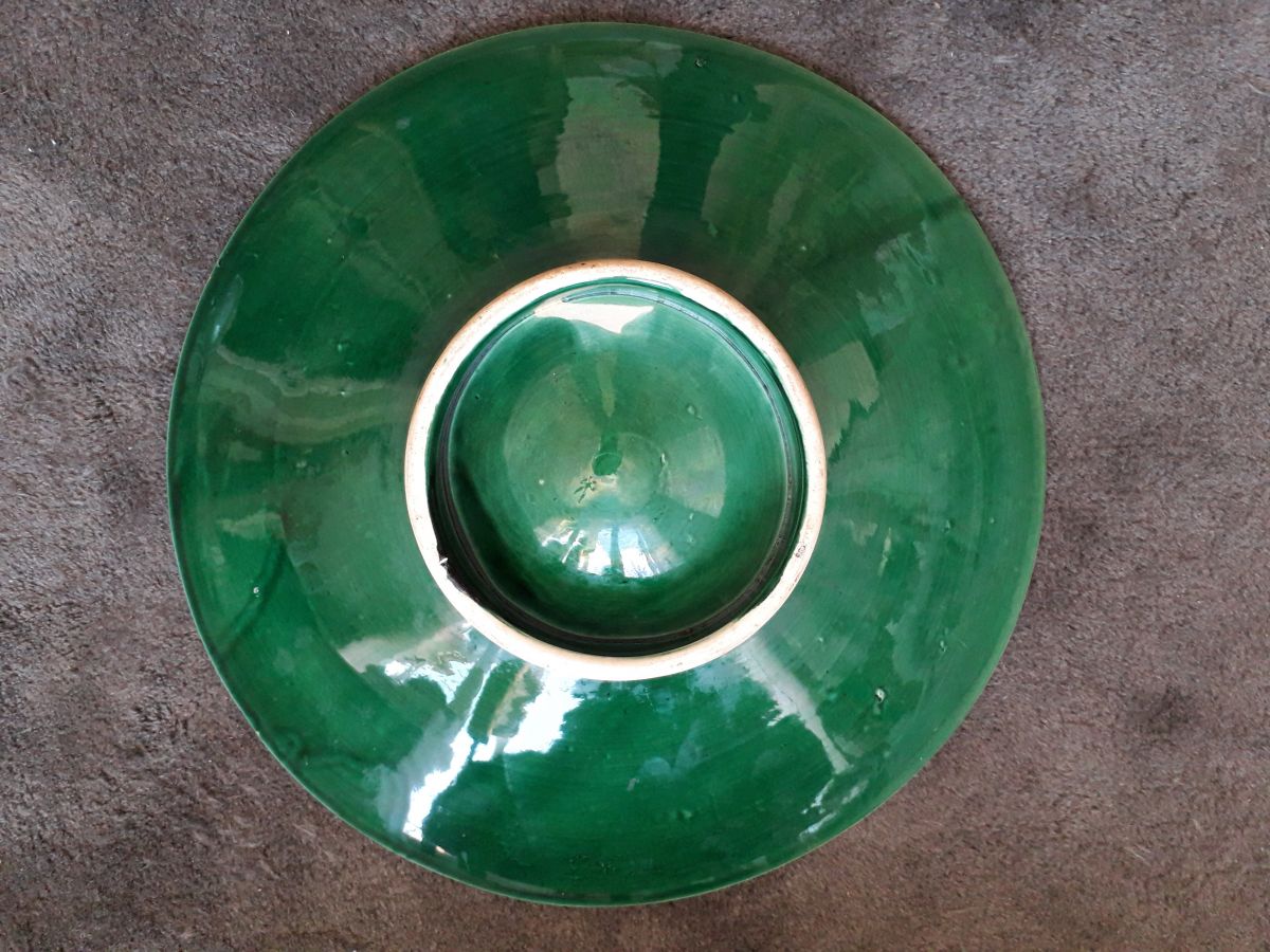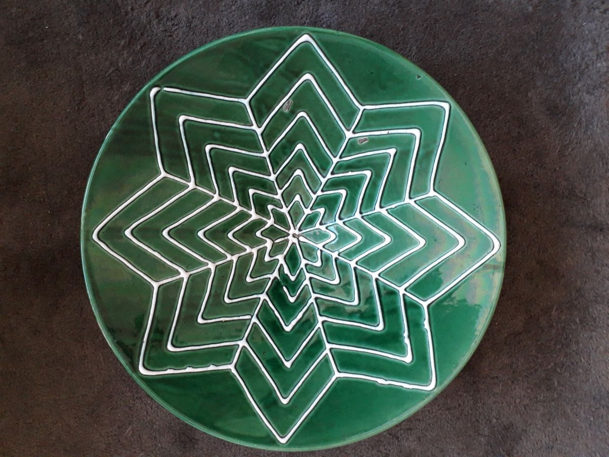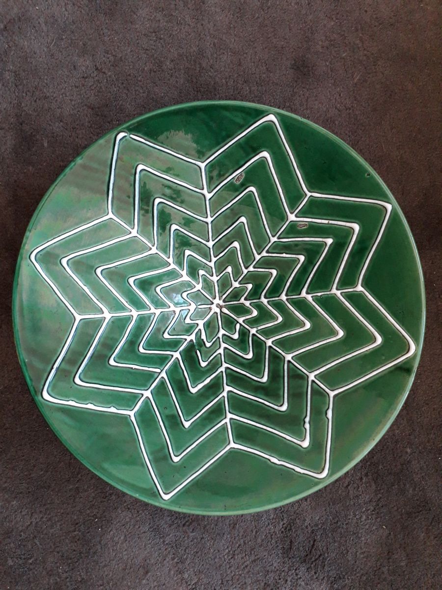 Grand plat vert en céramique Vallauris au décor géométrique en forme d'étoile.