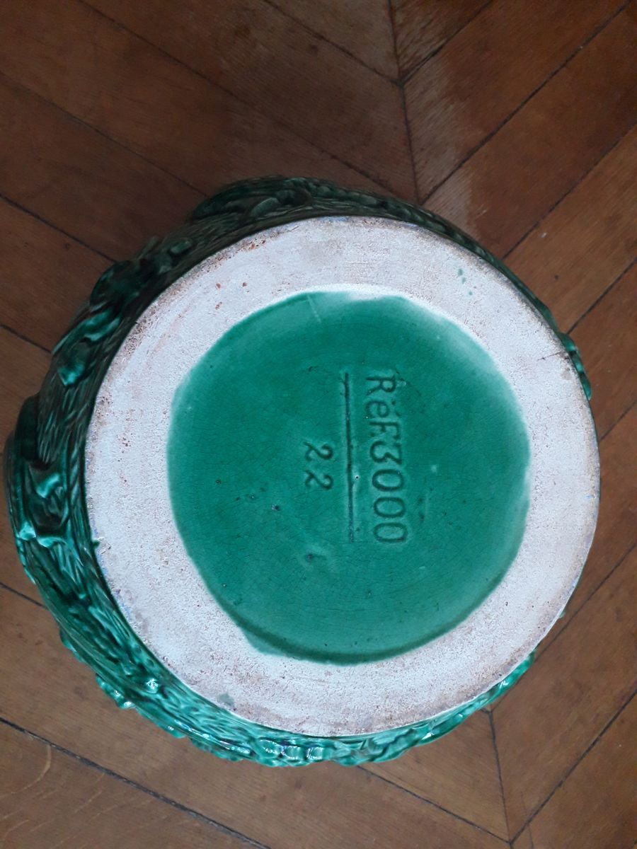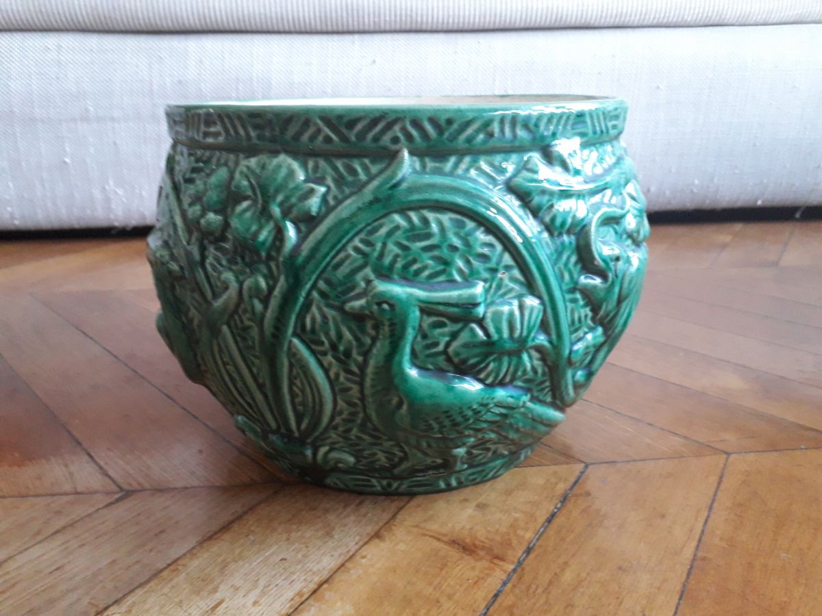 Céramique vintage en barbotine verte avec un décor original animalier et végétal.