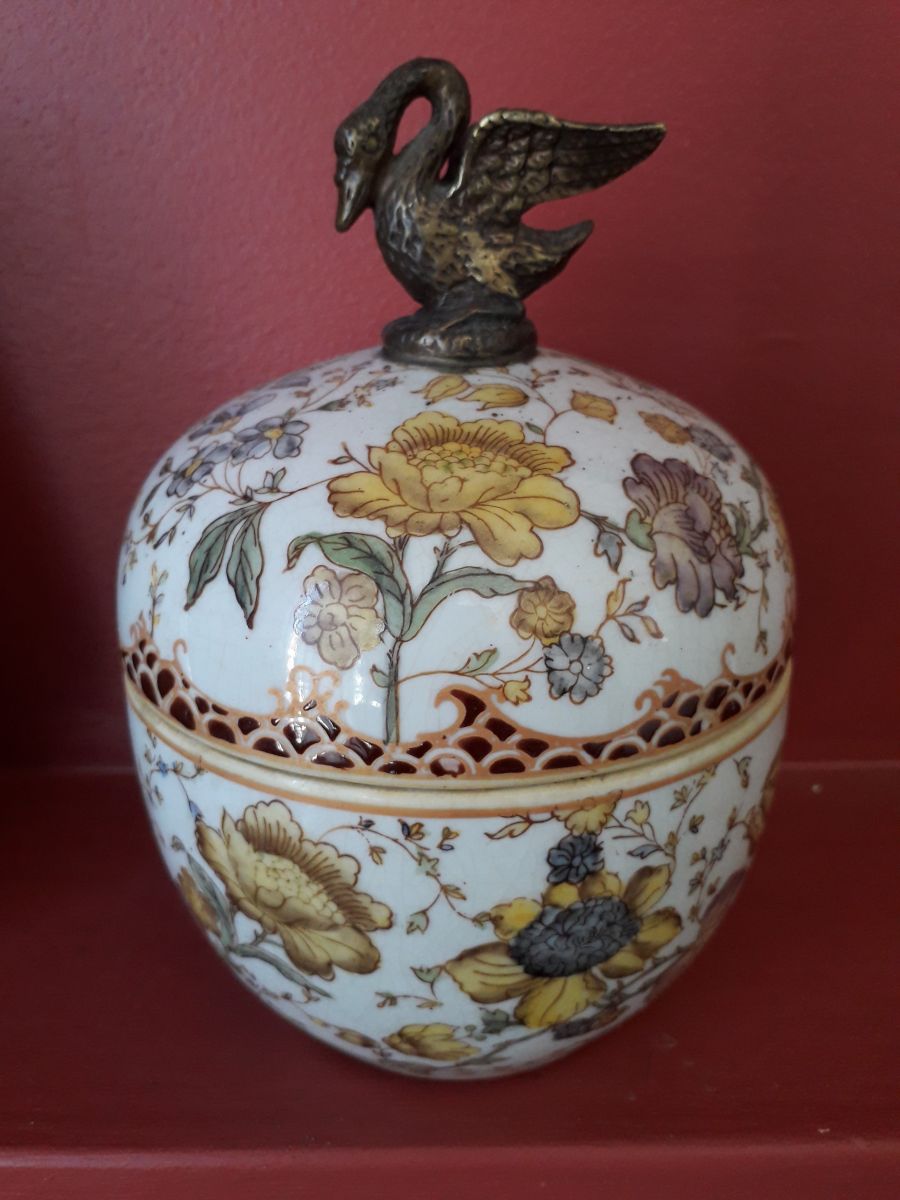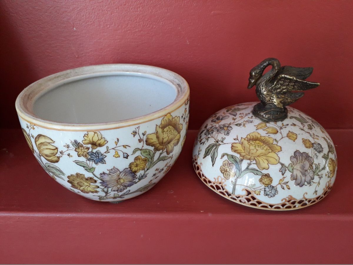 Céramique ancienne avec un motif floral raffiné et un cygne en bronze sur le couvercle.