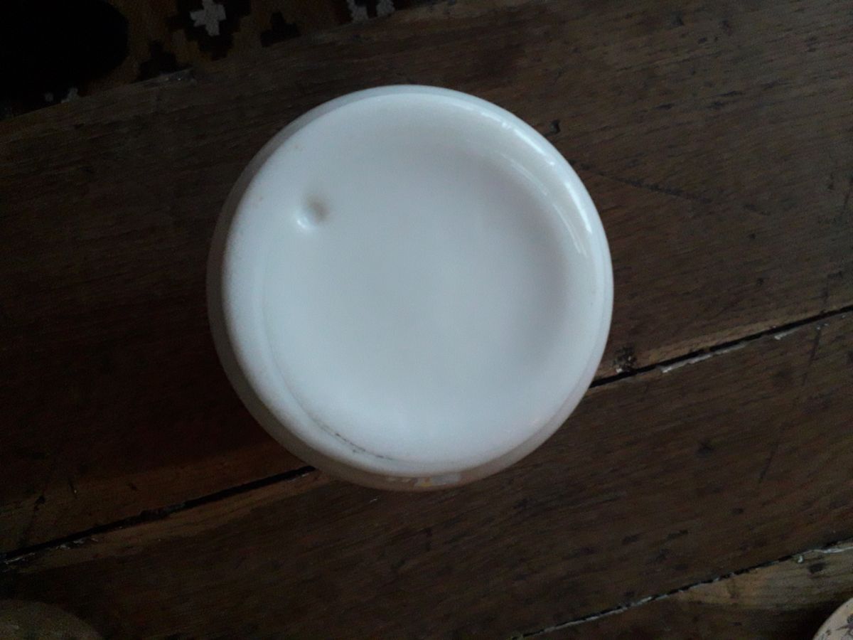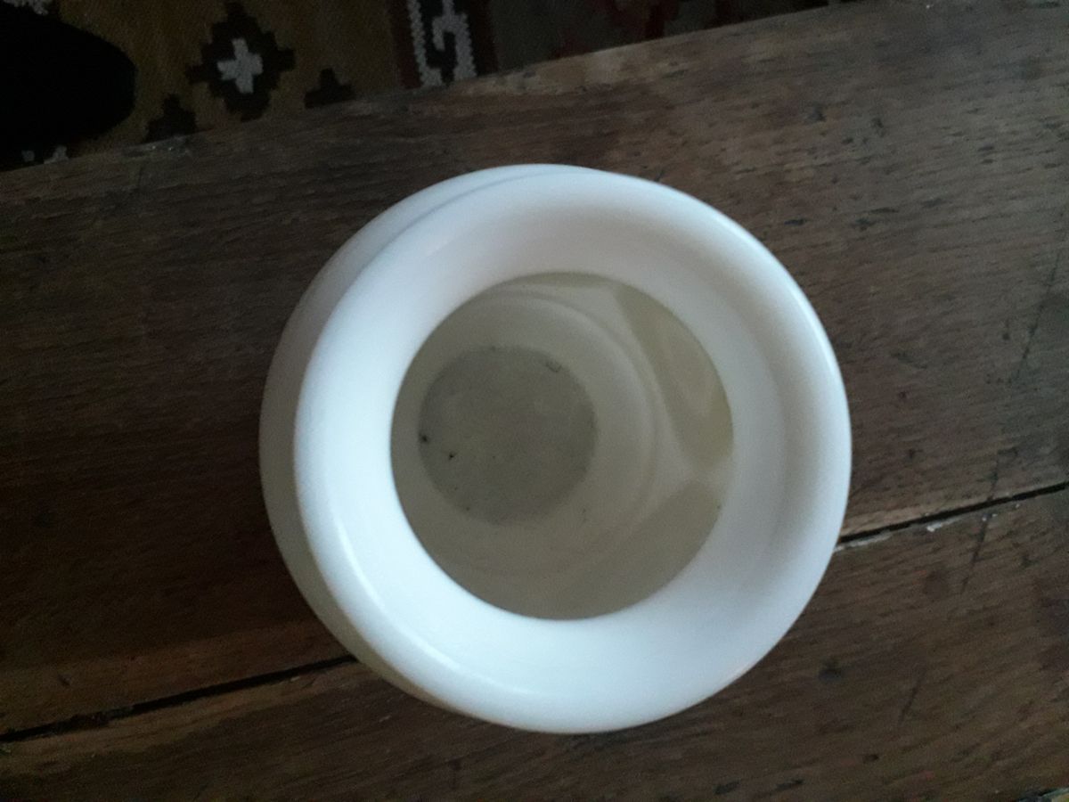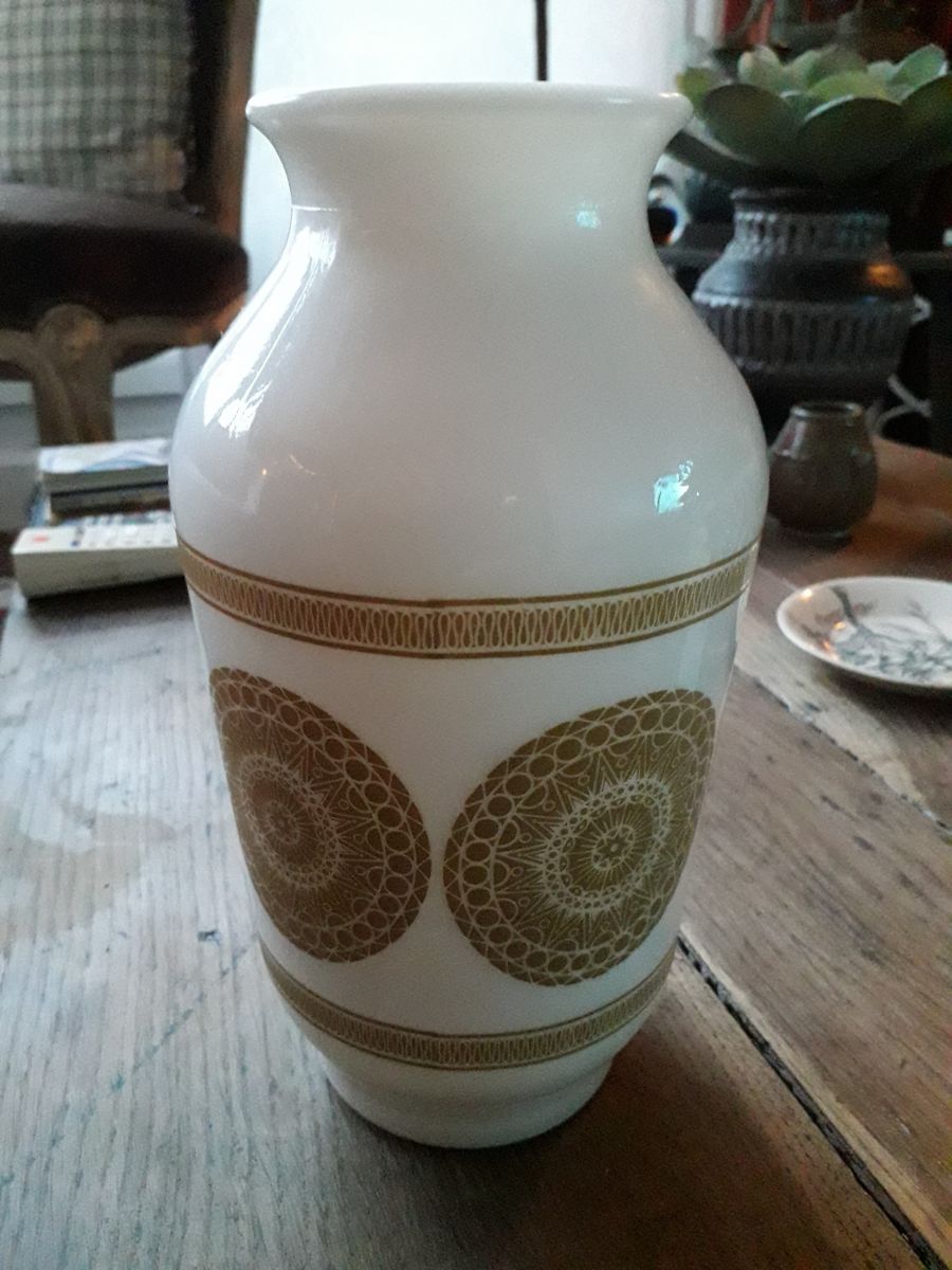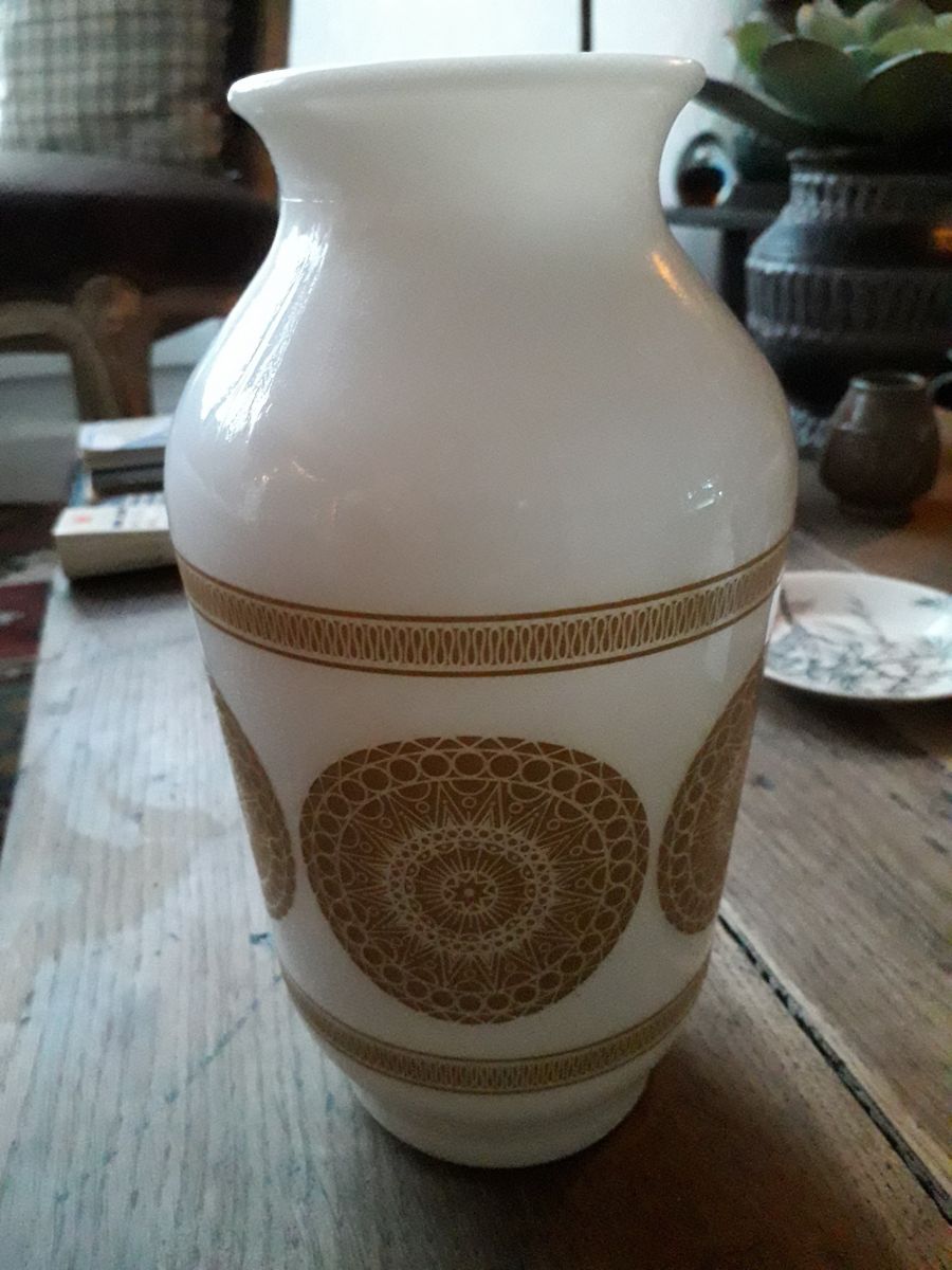 Vase vintage des années 70 en opaline blanc avec un décor géométrique de couleur sable.