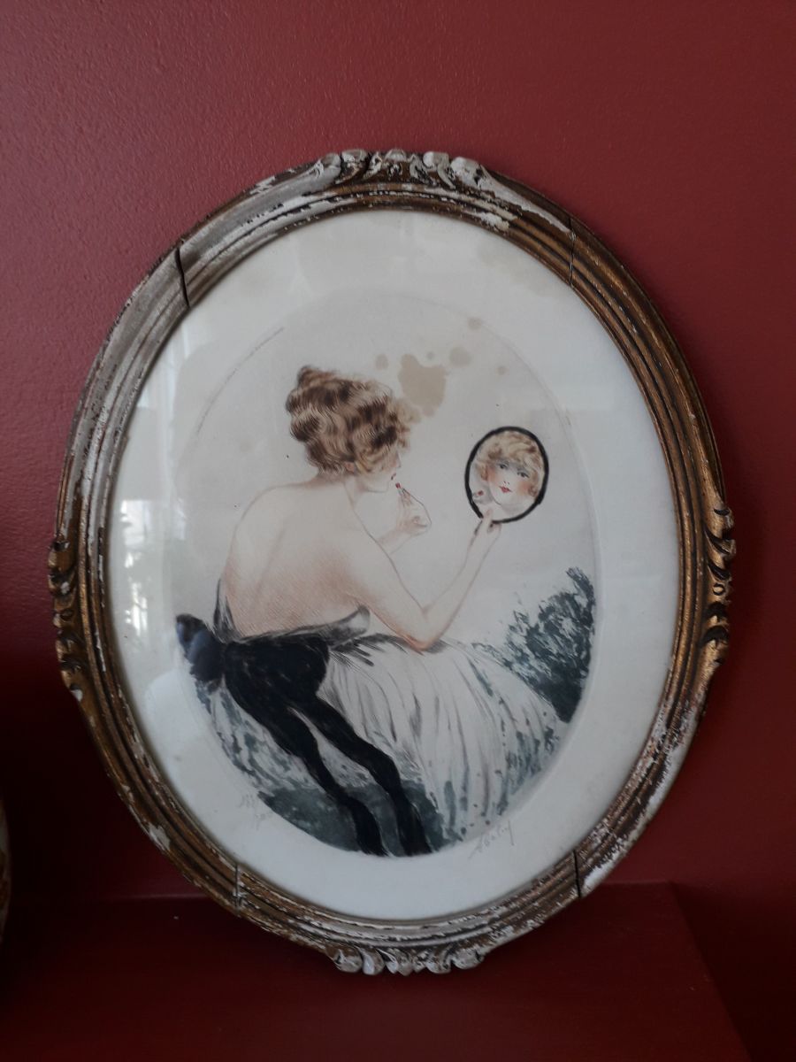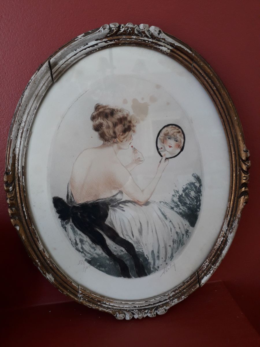 Tableau ancien style art-déco la dame au miroir signé Abely.