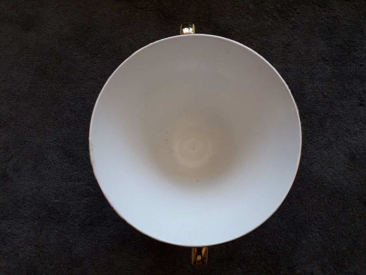 Coupe vintage en céramique de Salins. La céramique est de couleur jaune avec un motif en relief quadrillé et un liseret or sur les anses , le col et le fond.