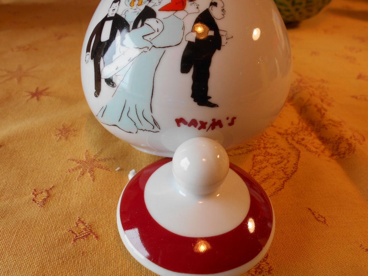 Sucrier blanc signée Chez Maxim’s Paris datant des années 80. Chez Maxim’s est un restaurant situé à Paris dans le quartier de la Madeleine. Fondé en 1893, il est l'un des établissements les plus célèbres de la capitale française.