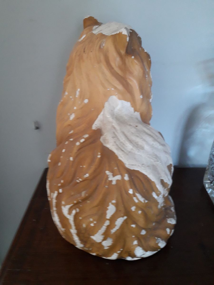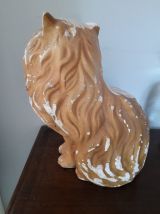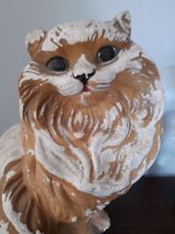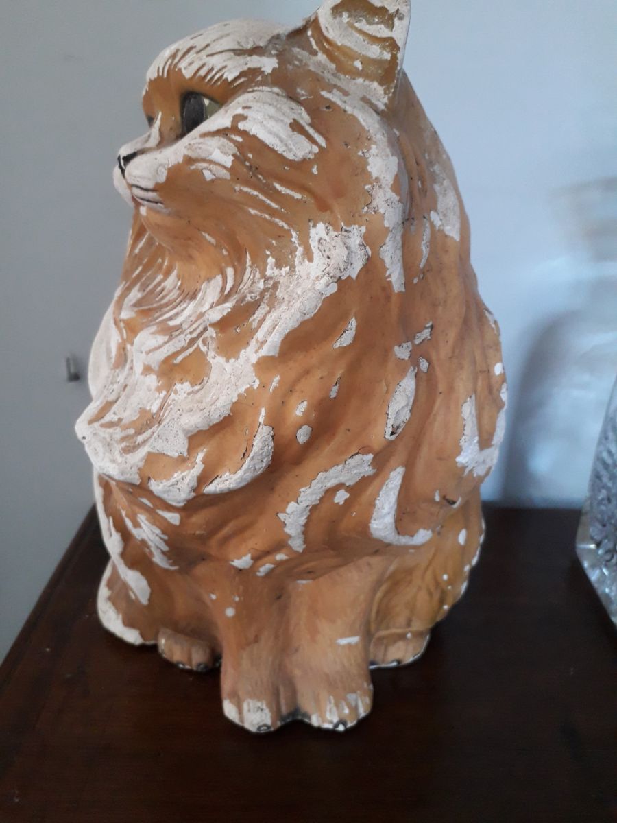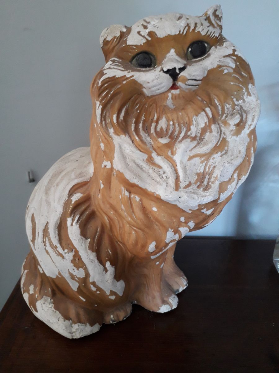 Chat vintage des années 50 en plâtre. Il est très ornemental dans un jardin et patiné avec des traces d'usure du temps.