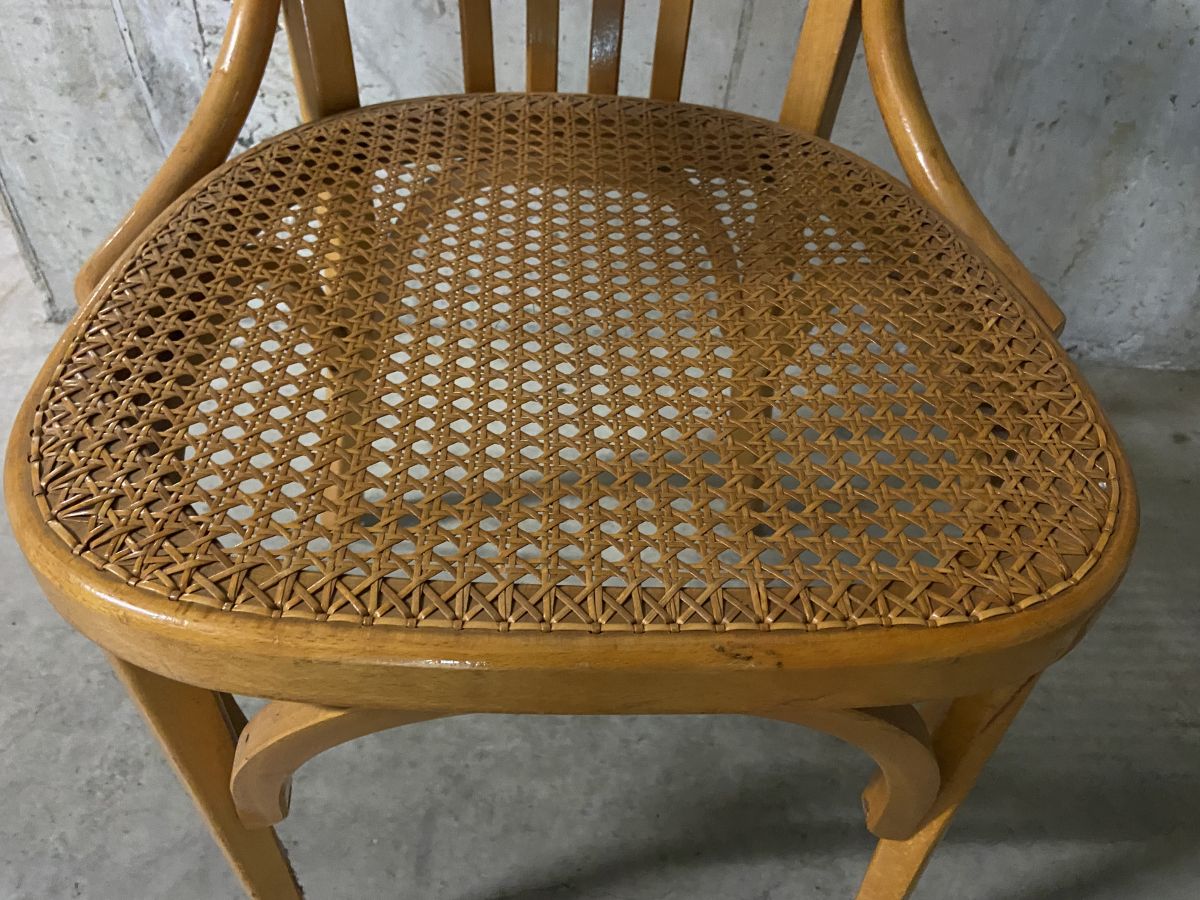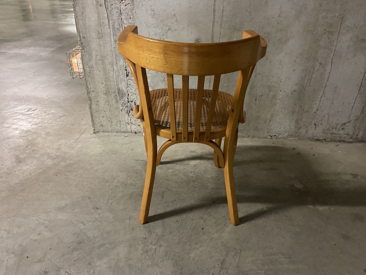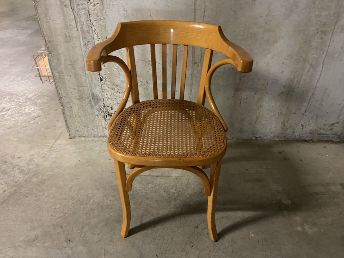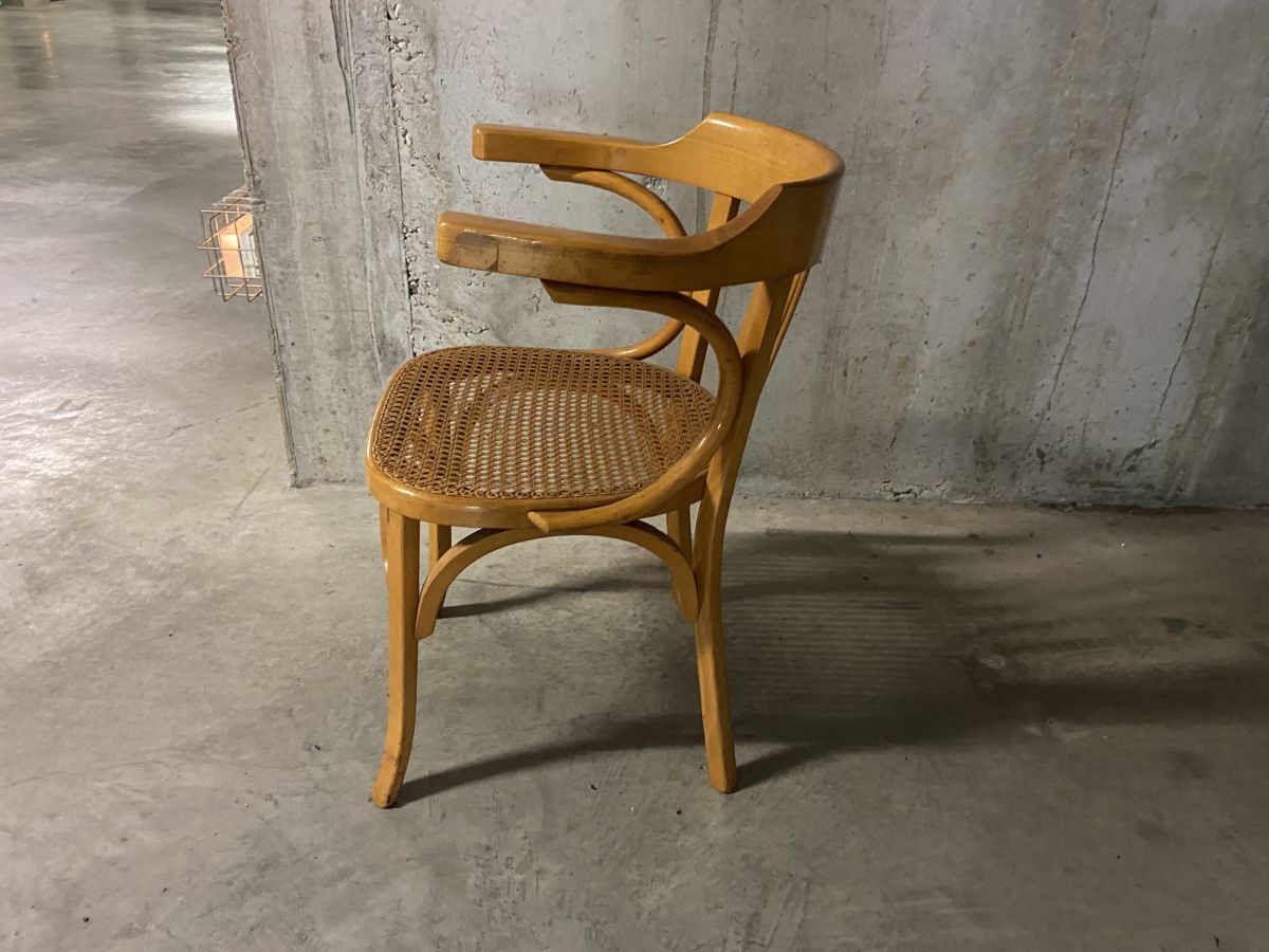 Fauteuil de bureau en bois et cannage des années 60, style Baumann, très belle patine, cannage impeccable, en très bon état, hauteur totale 78cm, hauteur assise 47cm, assise 45x45cm, bon état.
