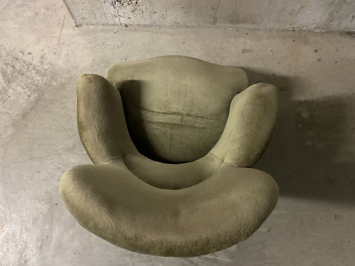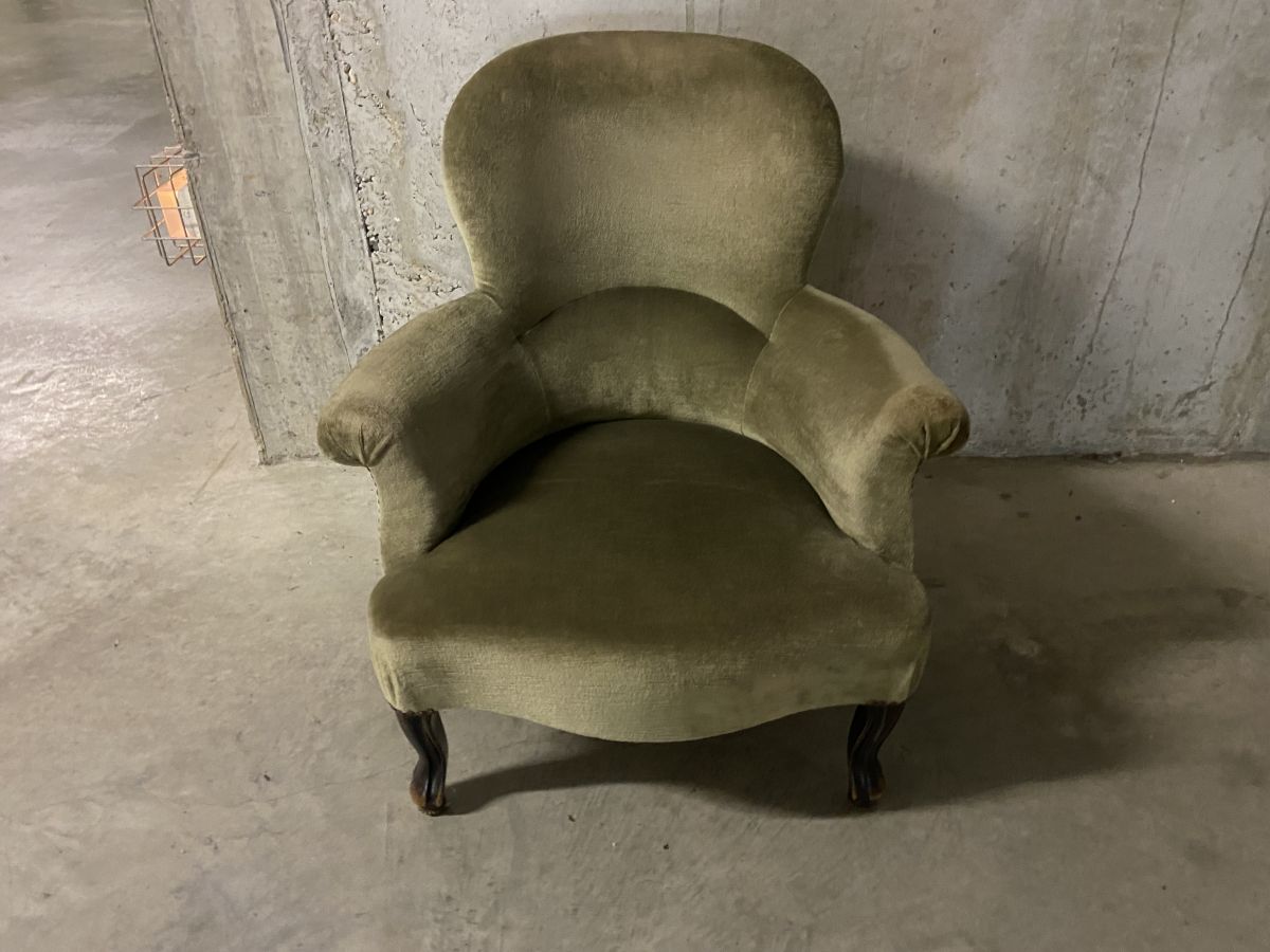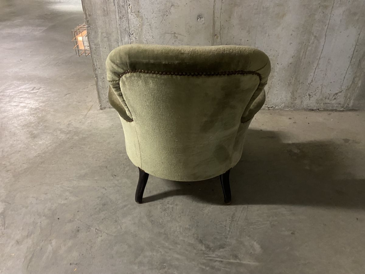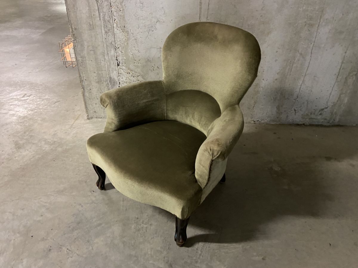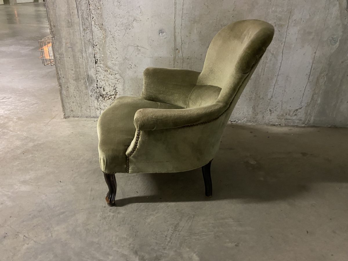Fauteuil crapaud de style Napoléon III, velours couleur vert amande, très stable et confortable, hauteur totale 75cm, hauteur assise 31cm, assise 44x50cm, bon état.