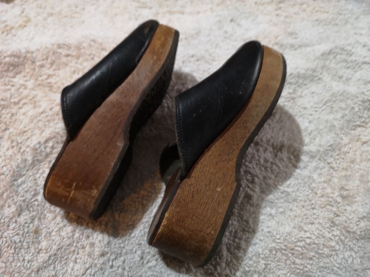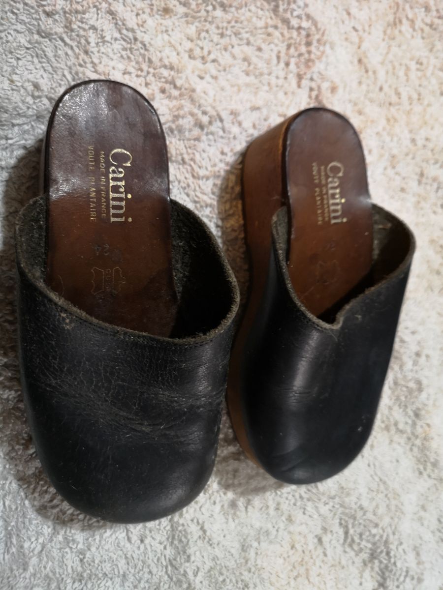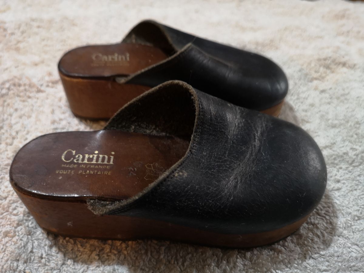 sabots anciens en cuir et bois de marque Carini pour collection théatre musée ou collectionneurs