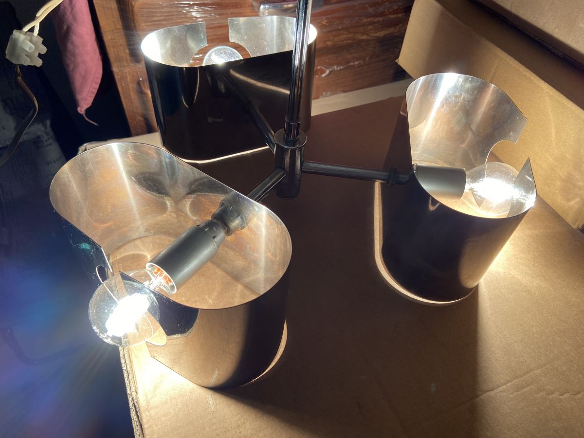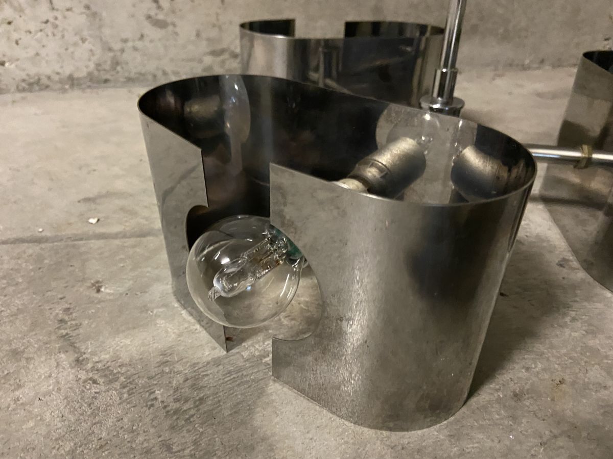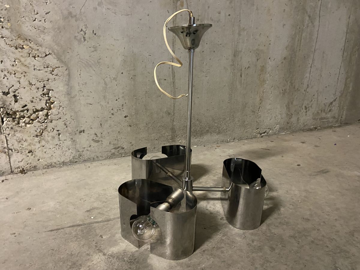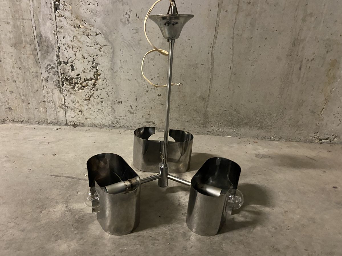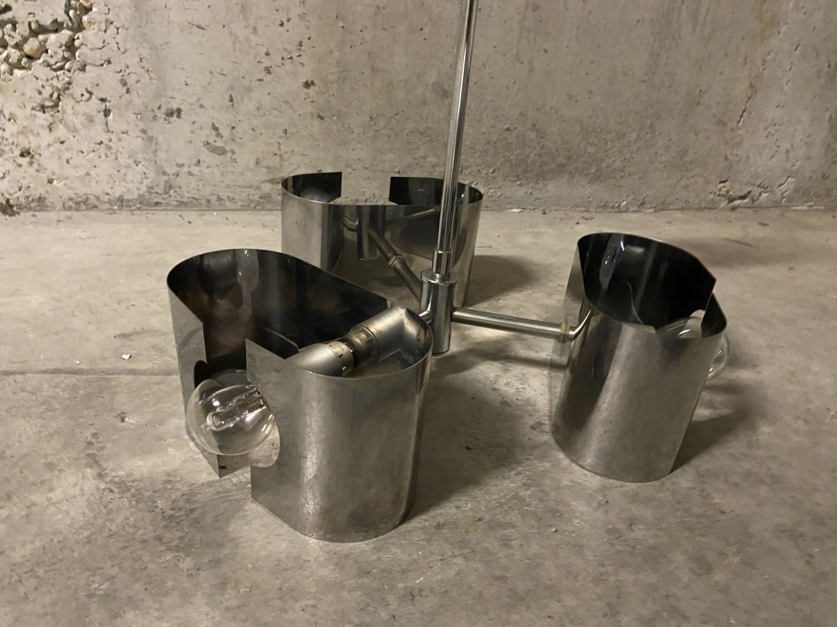 Suspension des années 70 de style Space Age, métal chromé, 3 ampoules, hauteur 41cm, diamètre 35cm, bon état.
