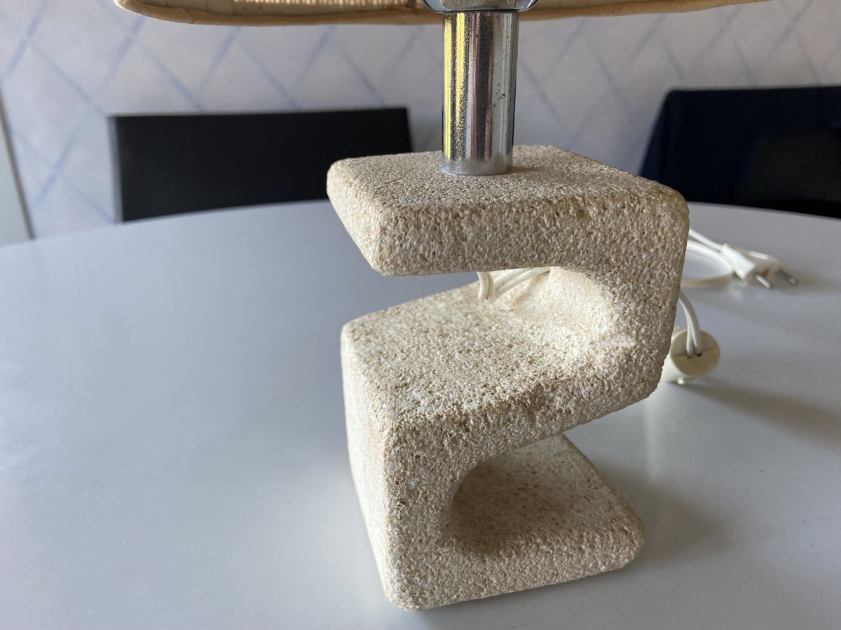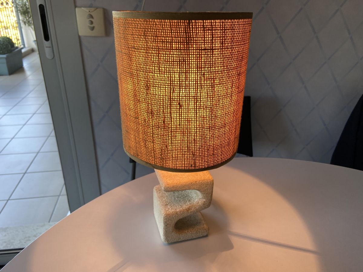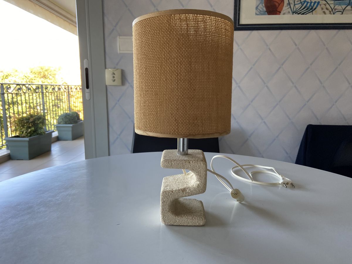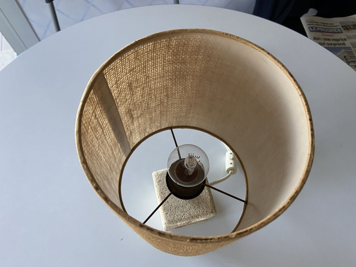 Lampe à poser brutaliste des années 70 en pierre, abat-jour en corde, hauteur totale 35cm, diamètre de l’abat-jour 17cm, socle 12X8cm, bon état.