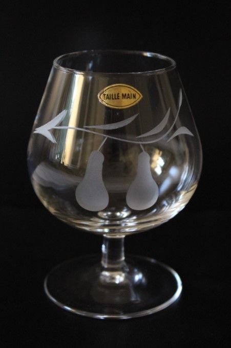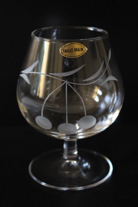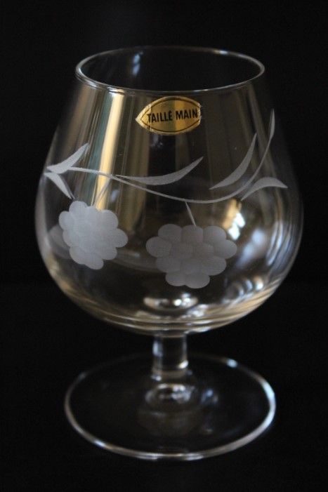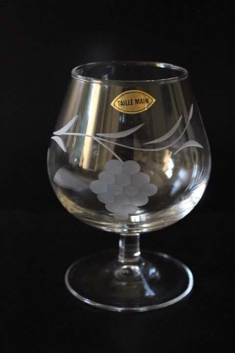 6 grands verres à Cognac et autres digestifs, en cristal d'Arques des années 60. Ils sont gravés à la main, chacun présentant un motif de fruit différent. Etat neuf, ils ont encore leur étiquette collée sur le verre et sont en parfait état. Le plateau de présentation n'est pas compris dans l'annonce.