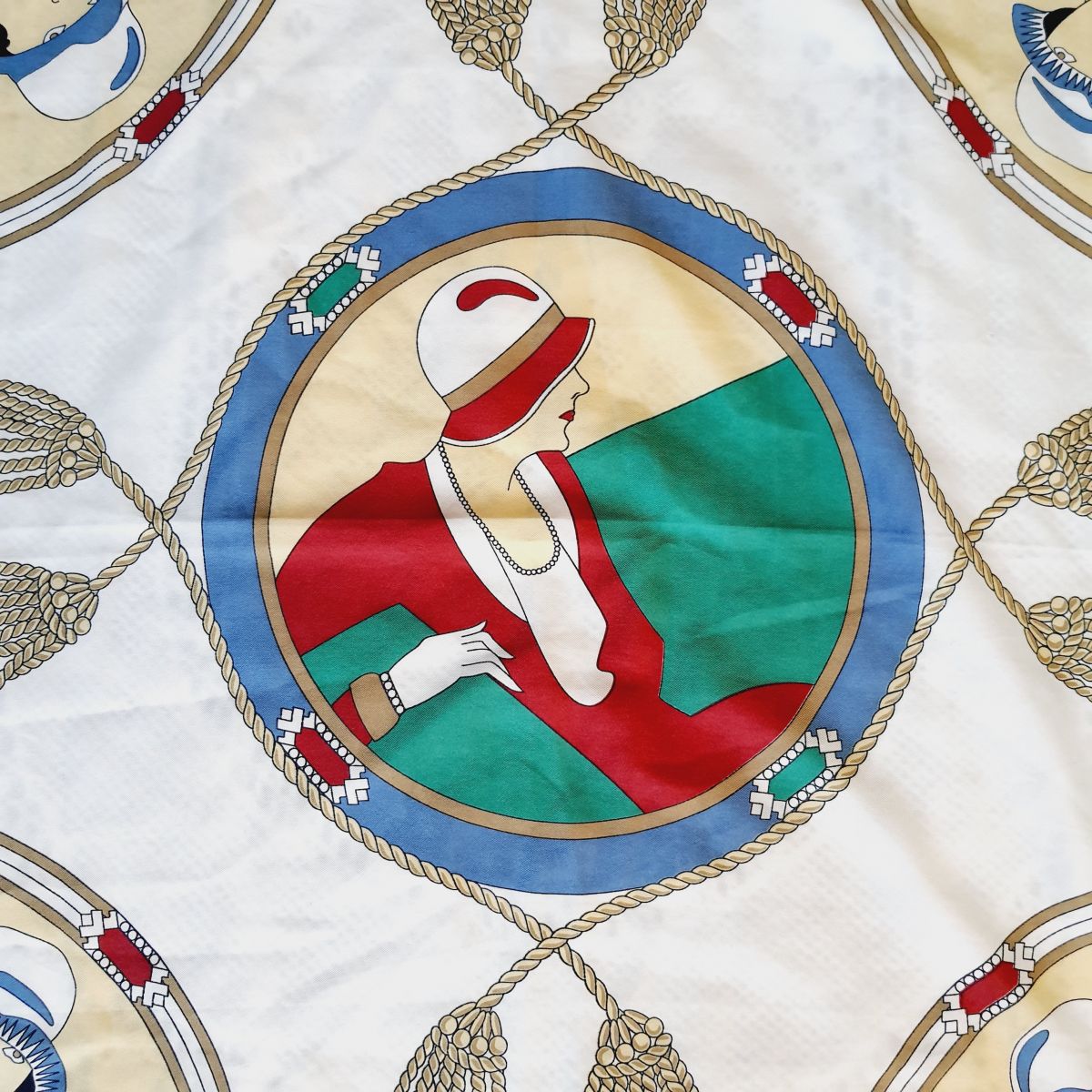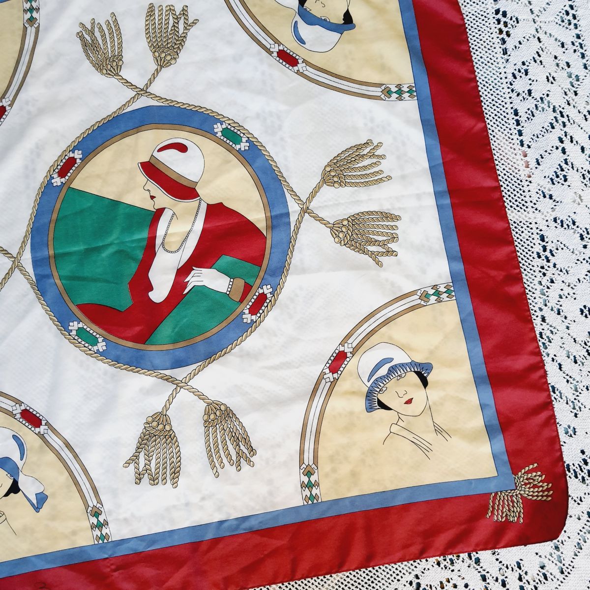 Foulard en polyester dominante bordeaux et beige décor femme années 30
