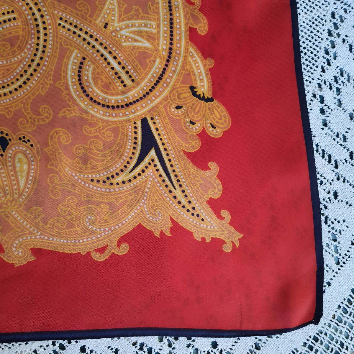 Foulard en polyester dominante rouge décor orange au centre