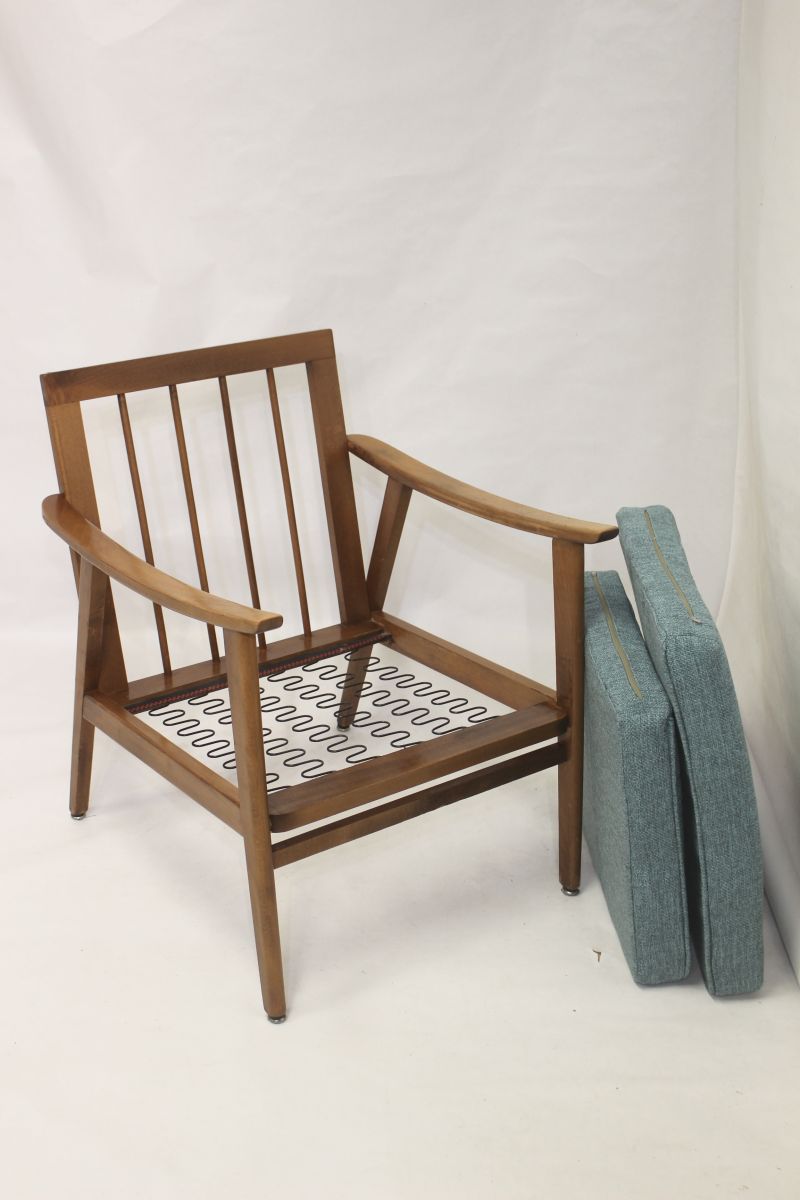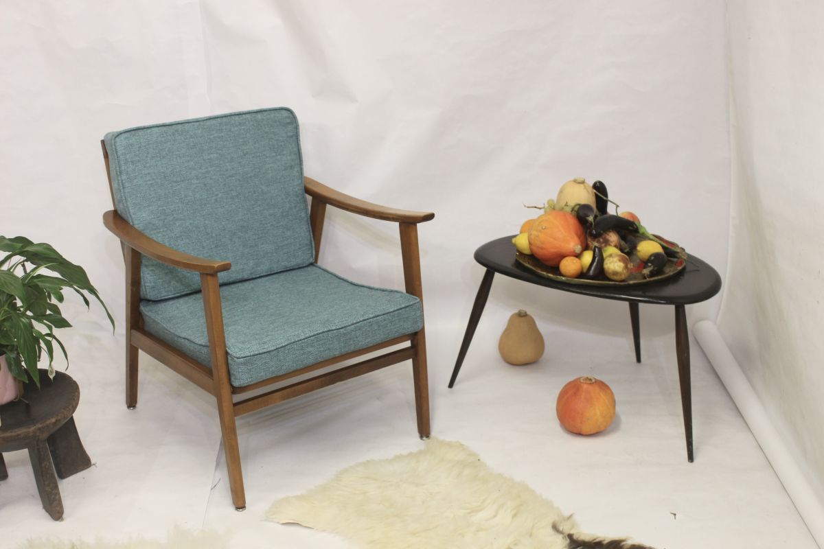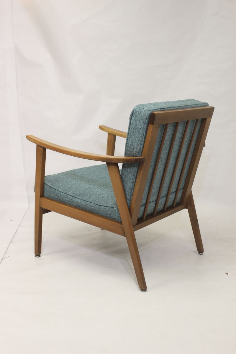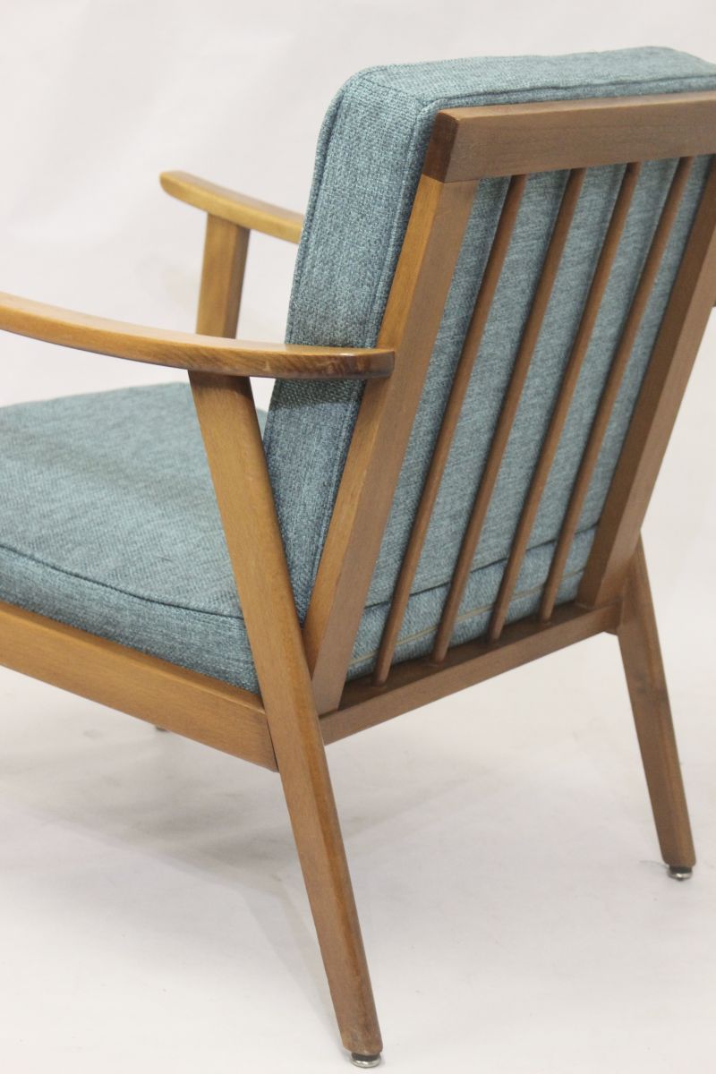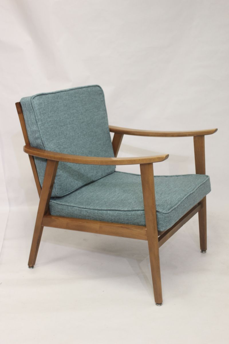 Fauteuil scandinave 1960 tissu bleu retapissé.
