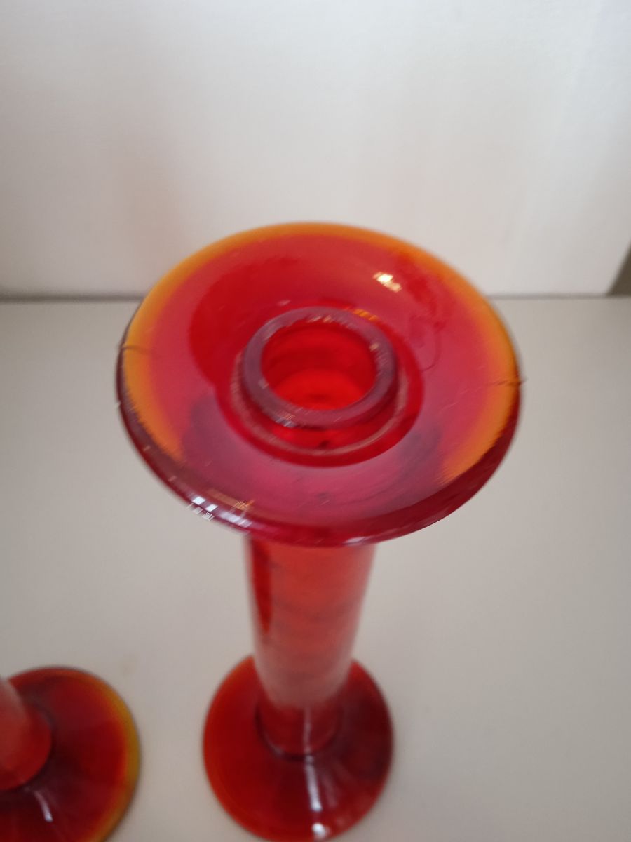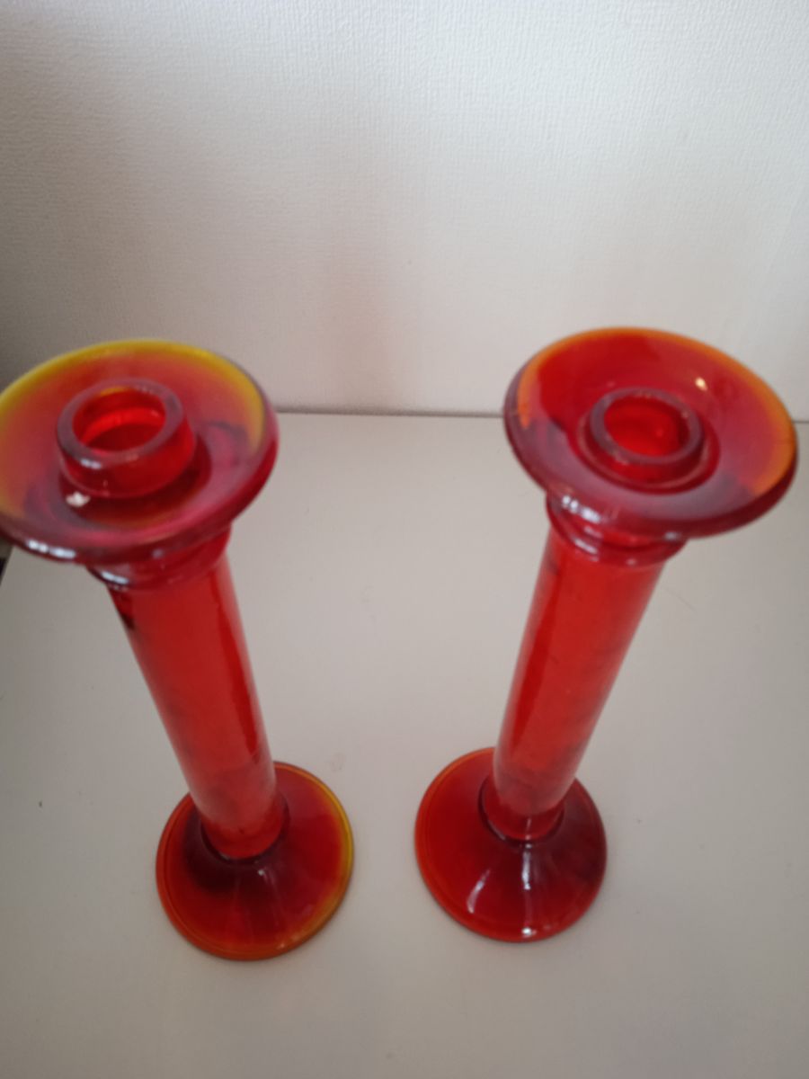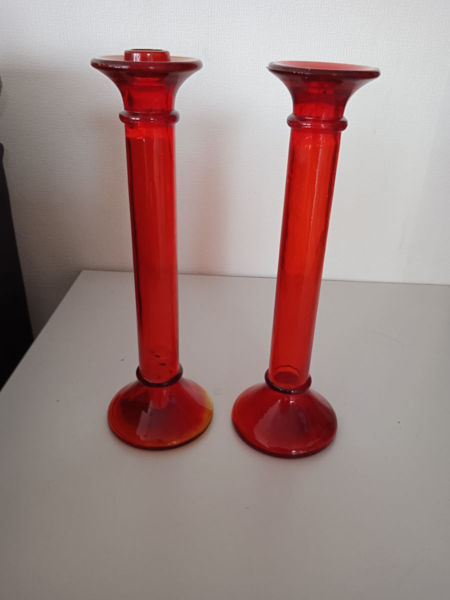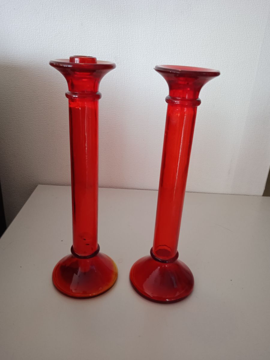 paire de bougeoirs en cristal en excellent etat comme neuf .de couleur rouge .aucun manque ni cassure .sublime pour les fetes . grand modèles .jamais servi vintage des années 1970