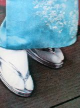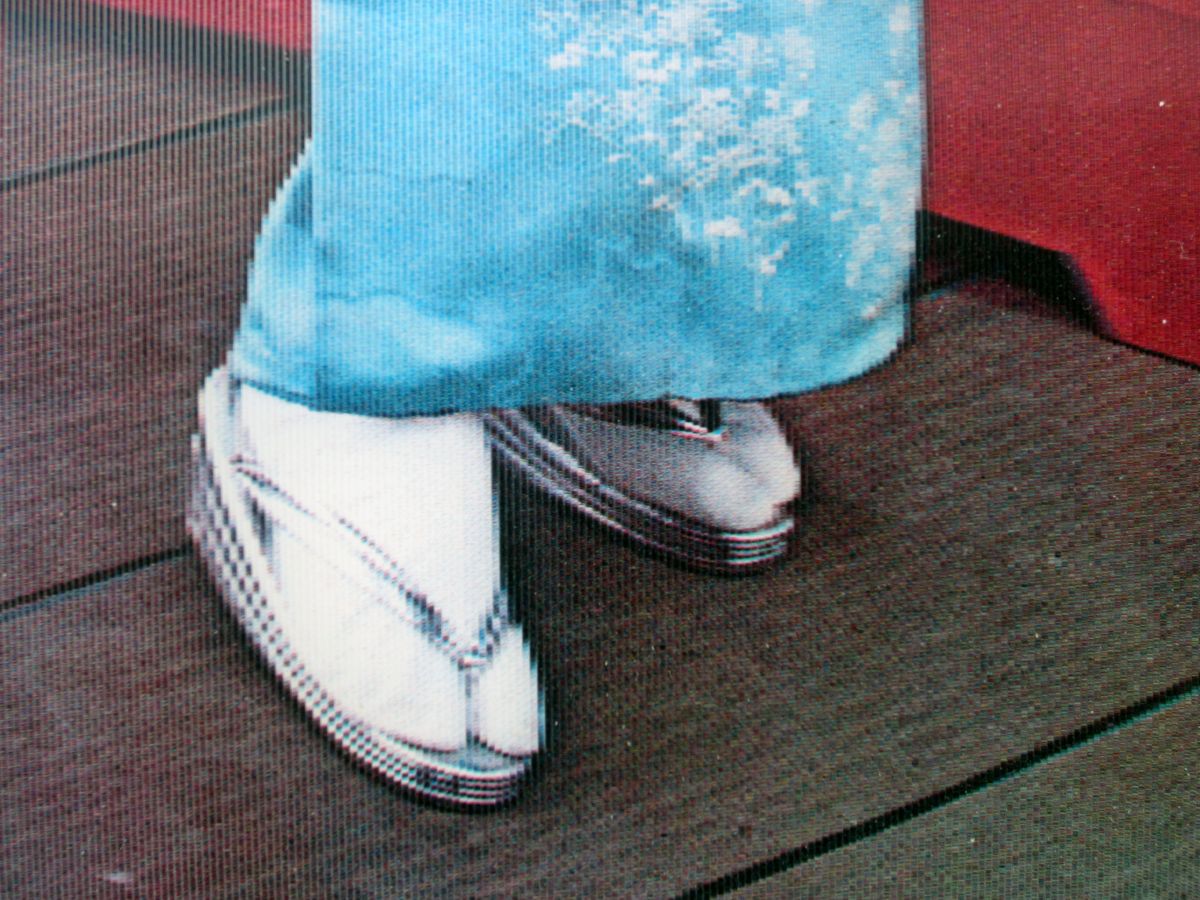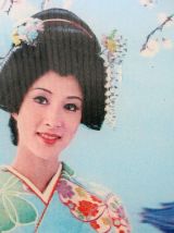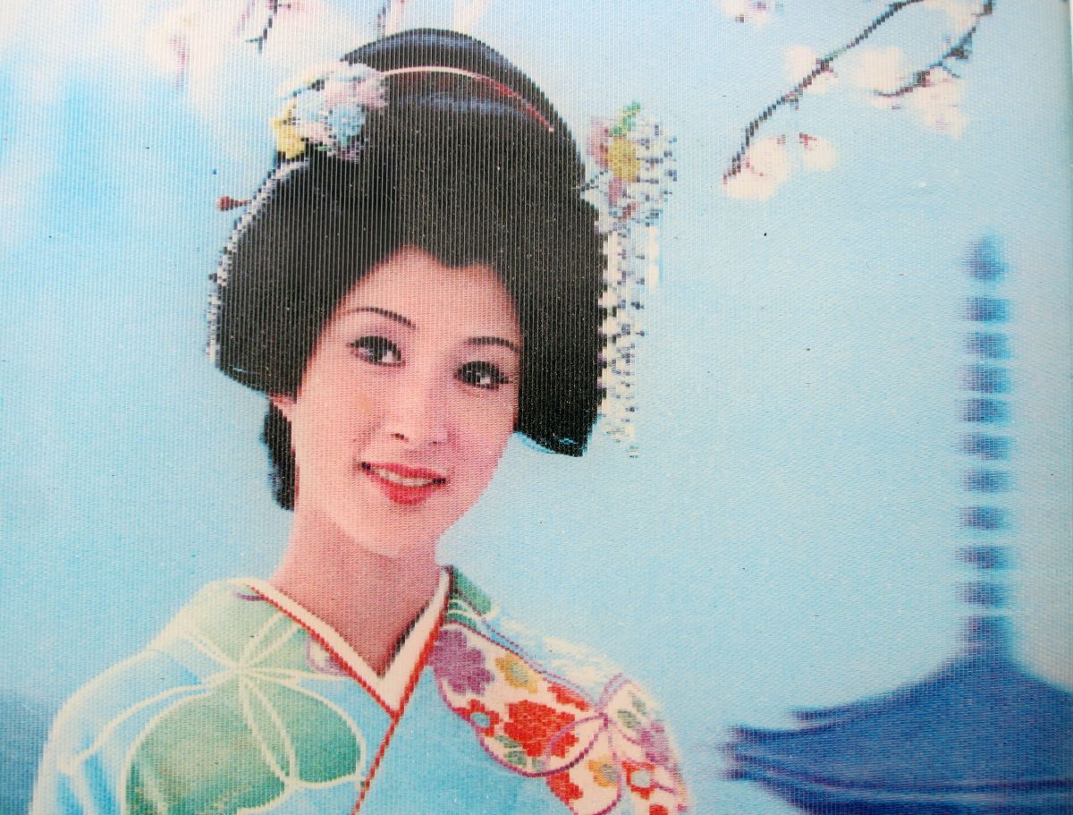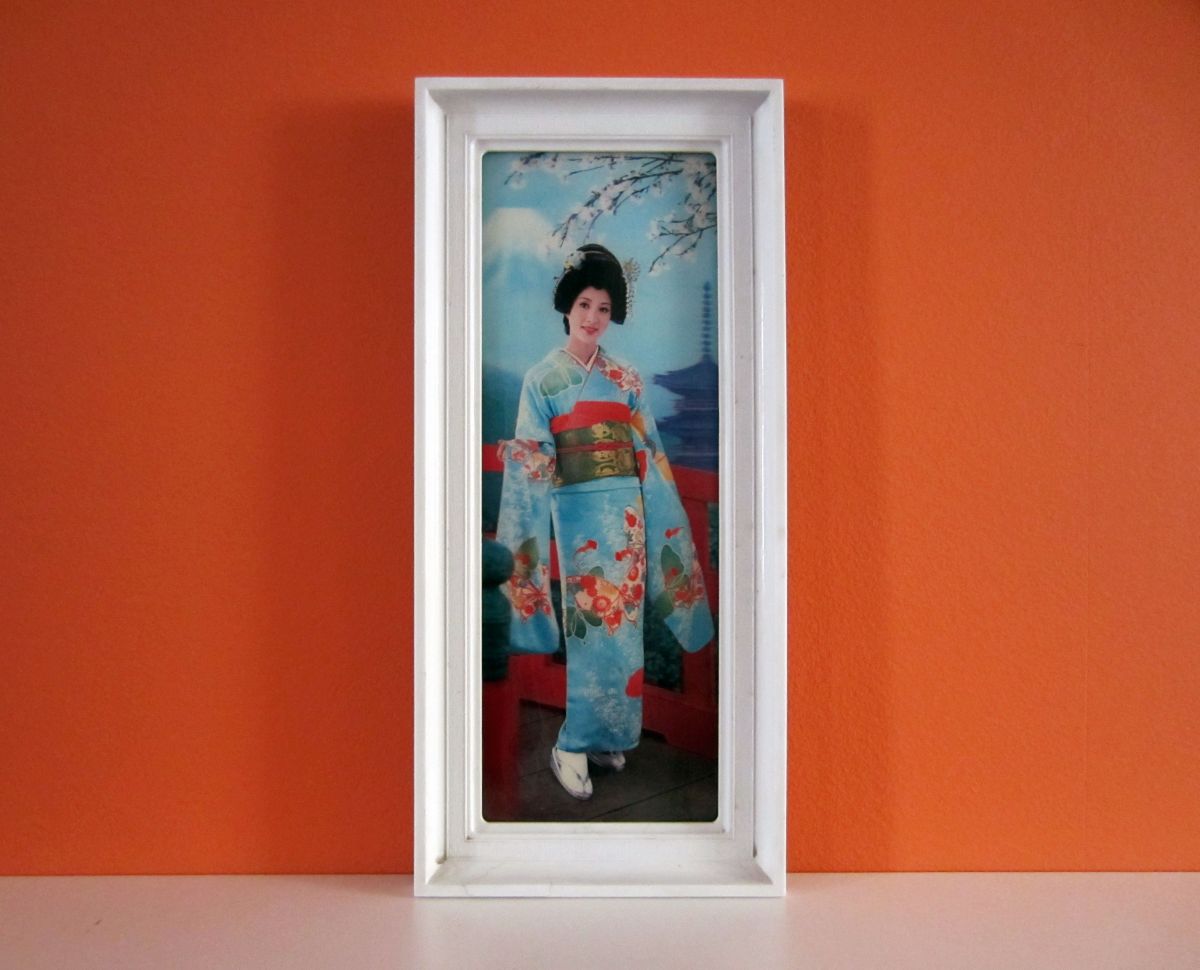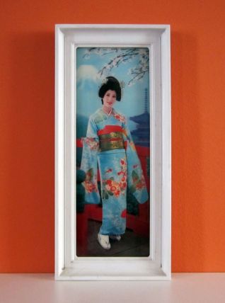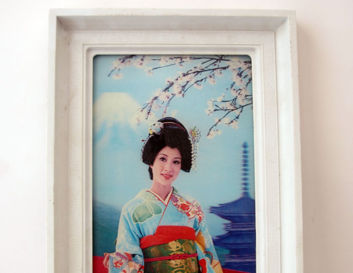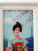 Jolie image lenticulaire (3D) vintage d’une geisha/femme japonaise vêtue d’un costume traditionnel bleu avec décor floral rouge sur fond de mont Fuji, d’un temple et de branches de fleurs de cerisiers (?) blanches. L’image (imprimée sur carton épais) est encadrée de plastique blanc. Doit sans doute dater des années 60 ou 70.