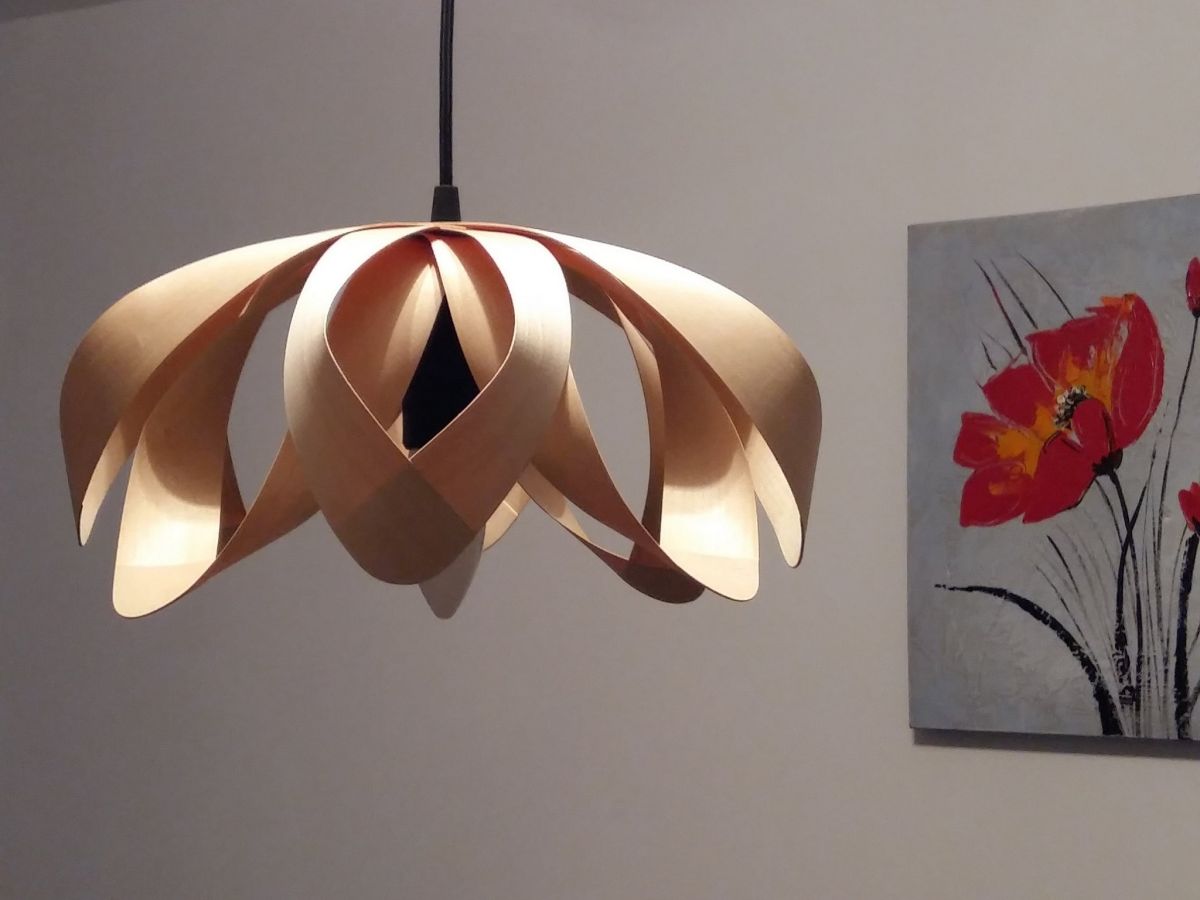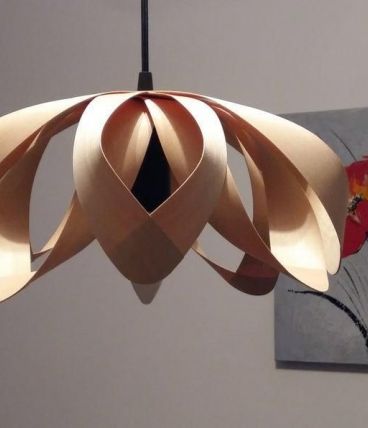 Cette lampe est en bois d'hickory d'un diamètre de 45 cm et d'une hauteur de 20 cm.