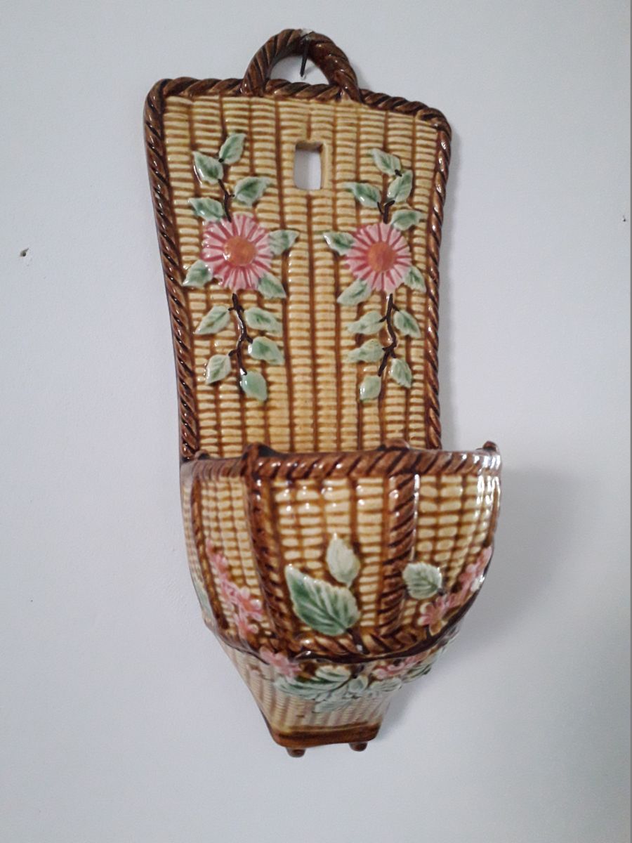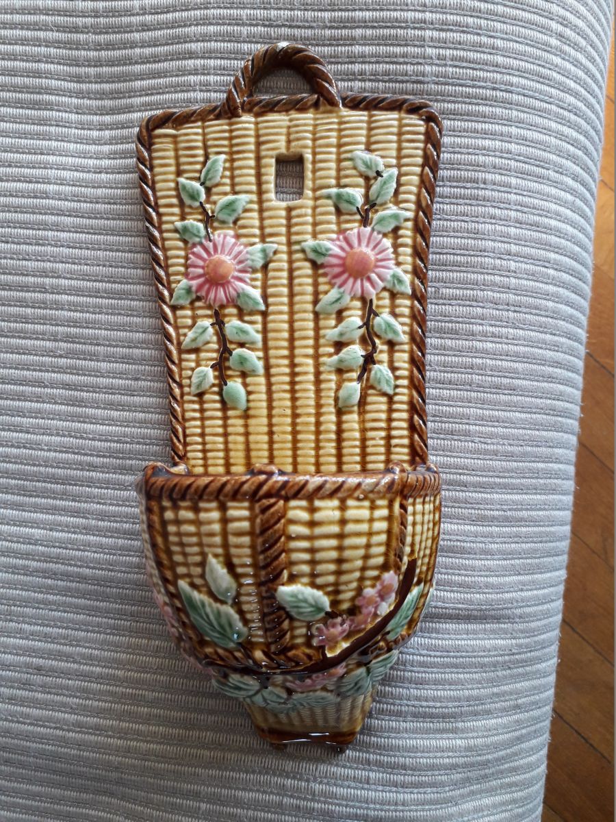 Céramique vintage en barbotine avec un effet tressé et un décor floral.