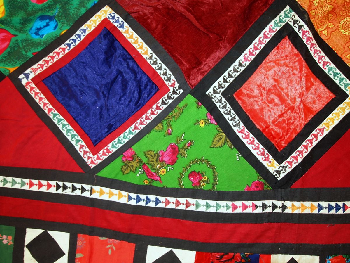 Hand made vintage Uzbek Suzani patchwork in original condition and in colourful shades. On the cotton red base there are velour diamond shaped patches along the centre of the rug. Also smaller squarish patches along the border. The Suzani is in original condition, has two little holes on it. It is very thin and might be perfect for a wall hanging.