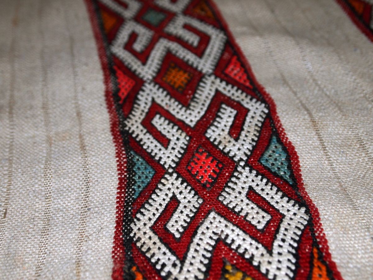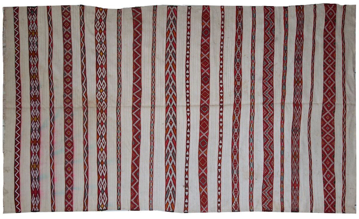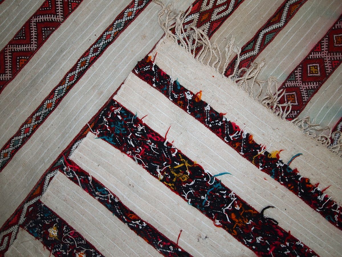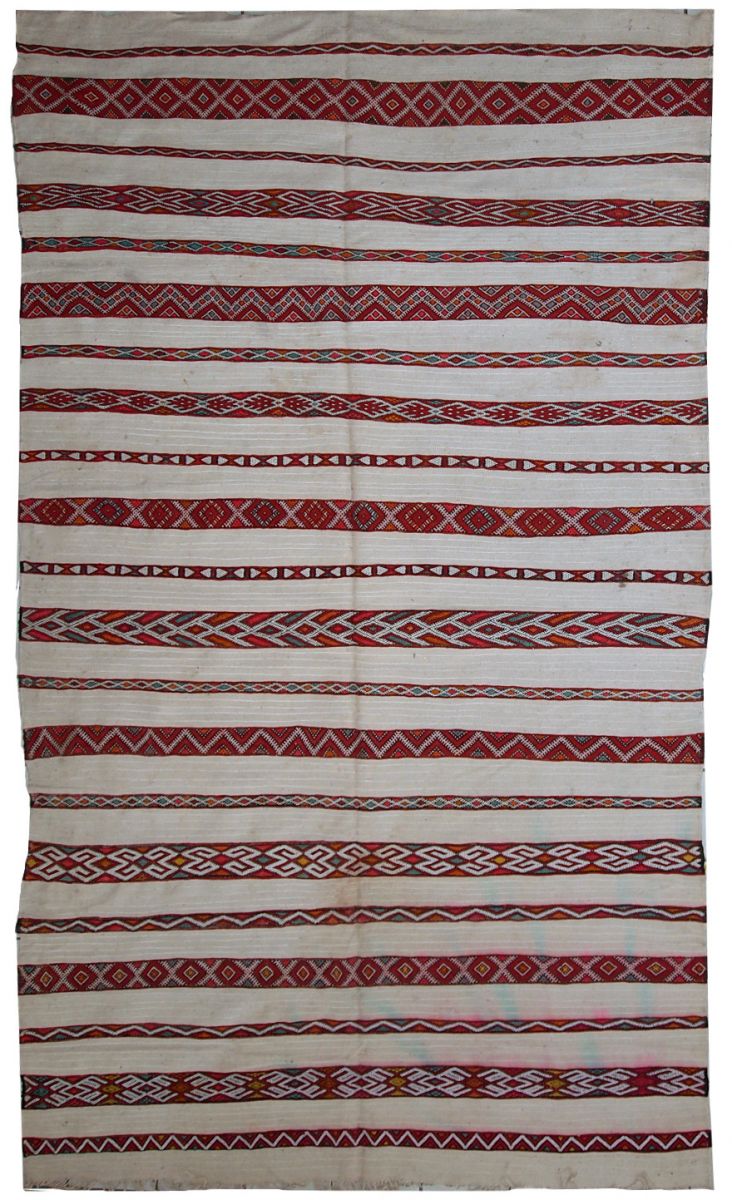 Hand made antique Moroccan kilim in beige shade with colourful stripes. This kilim is in original condition, it has some colour run.