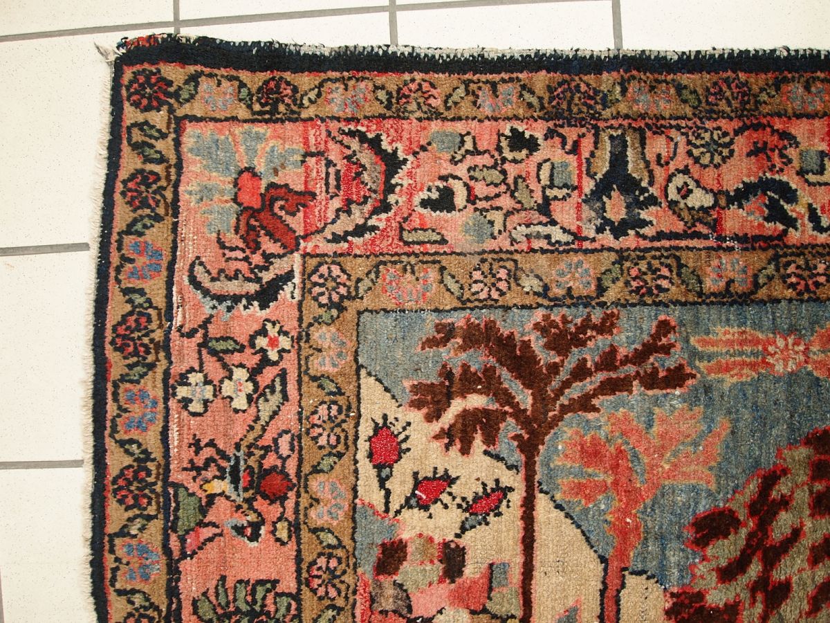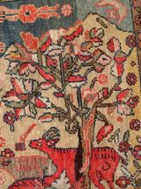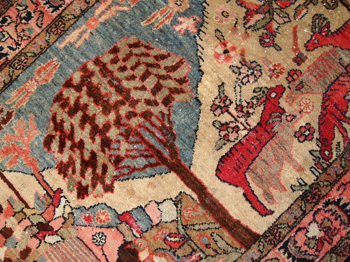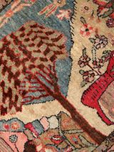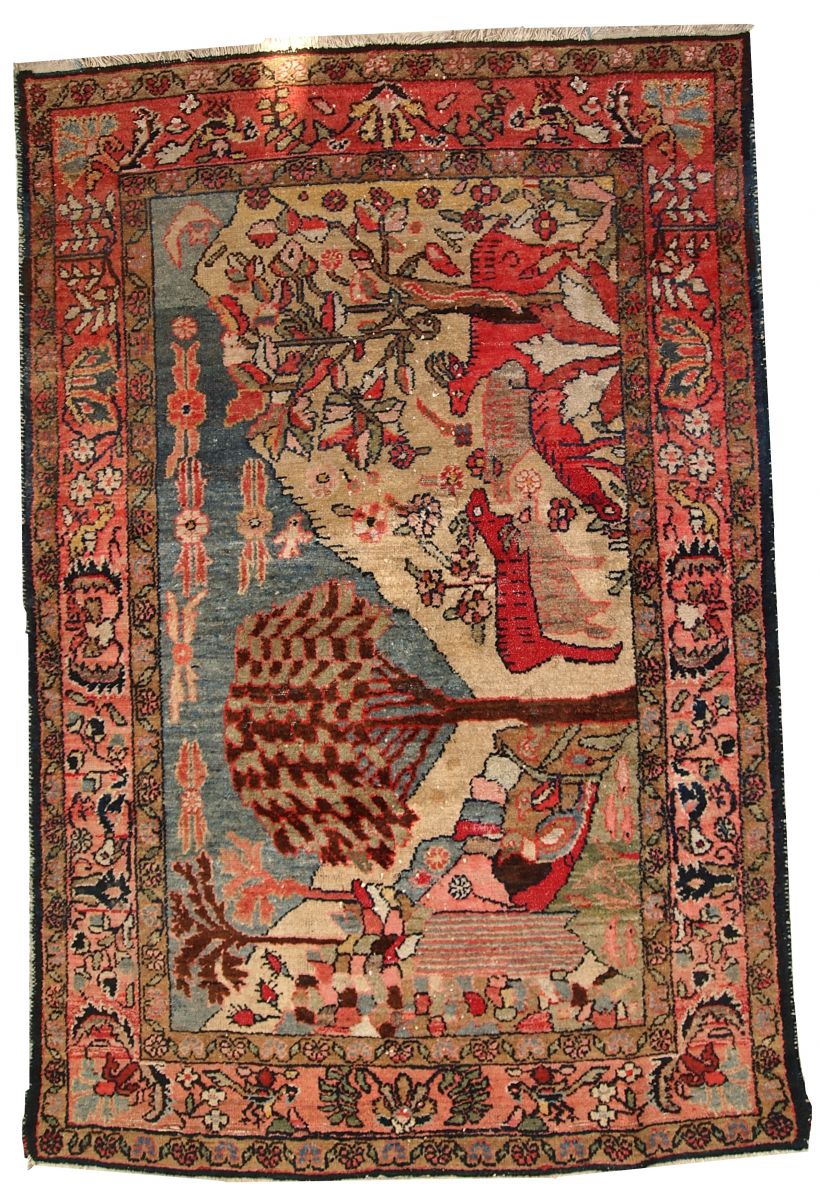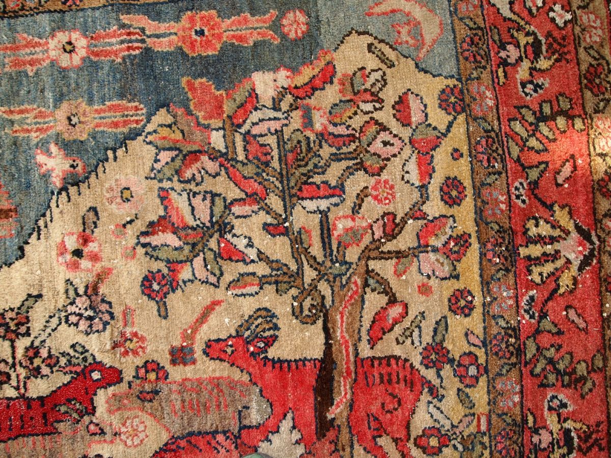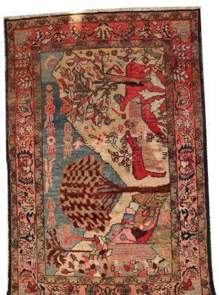 Very unusual antique Malayer rug. This hand woven masterpiece was made in 1920s. Very charming pictorial design and wonderful scenery pictured on this rug. In original condition- some areas has low pile.
