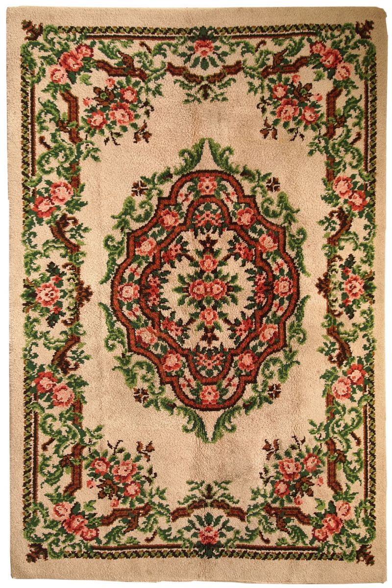 Vintage European Savonnerie rug in original good condition made from the soft wool. The beautiful garden design in green and red shades on the beige background.