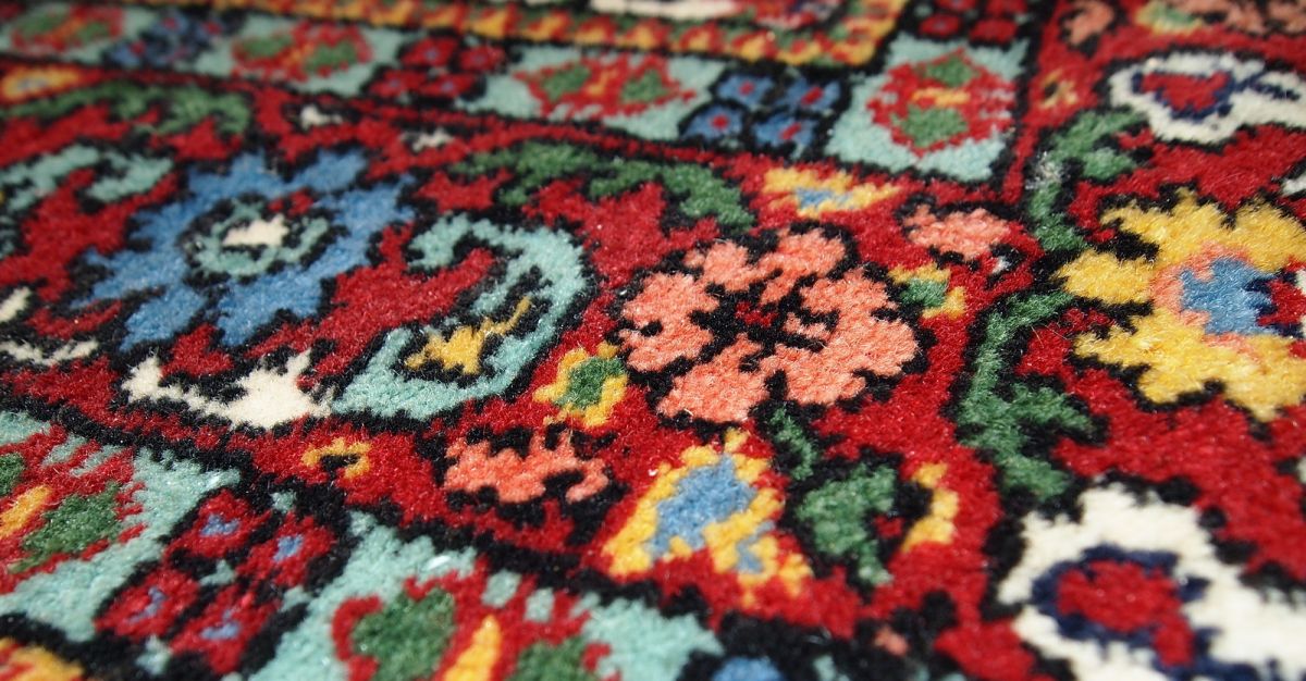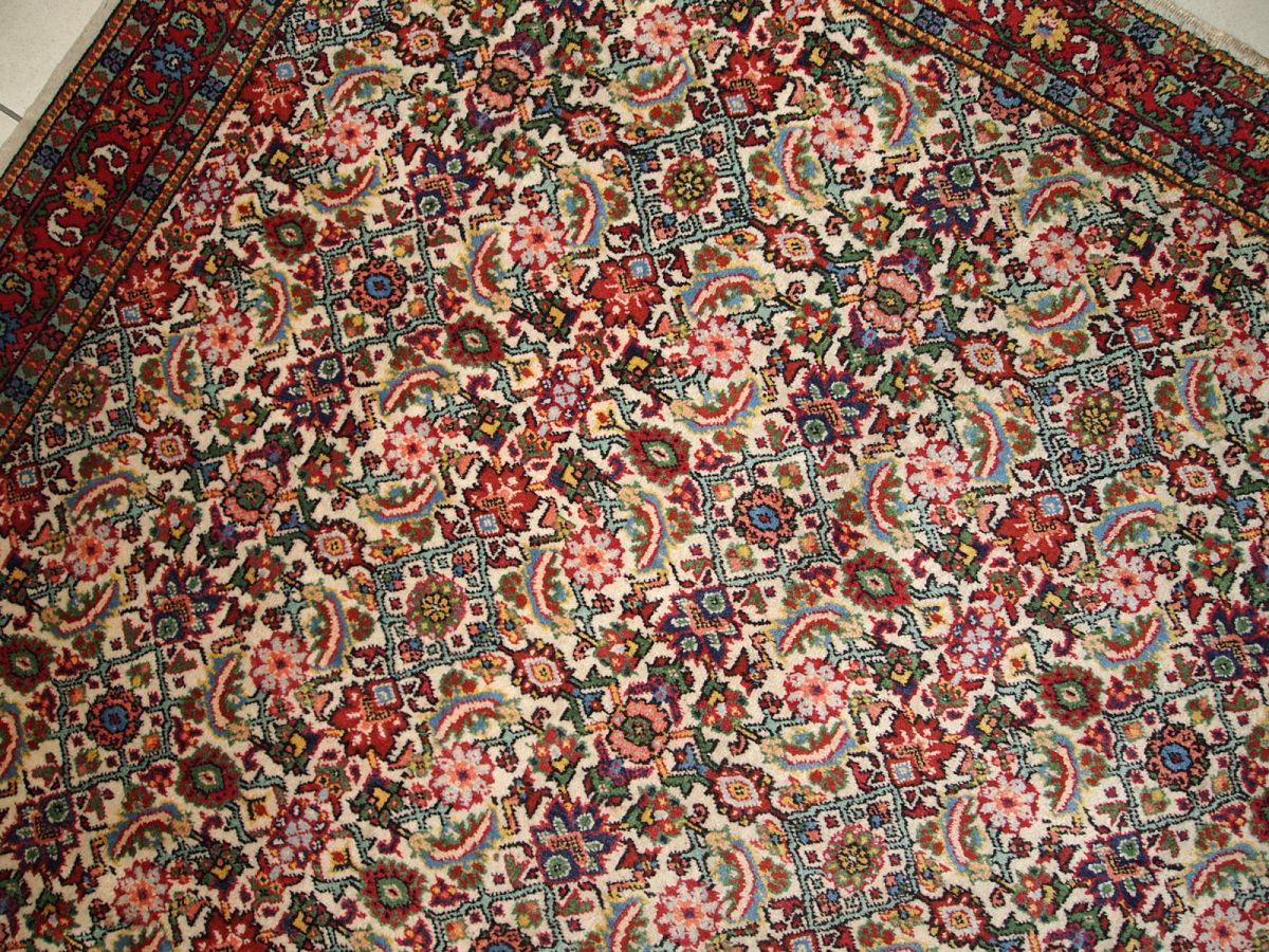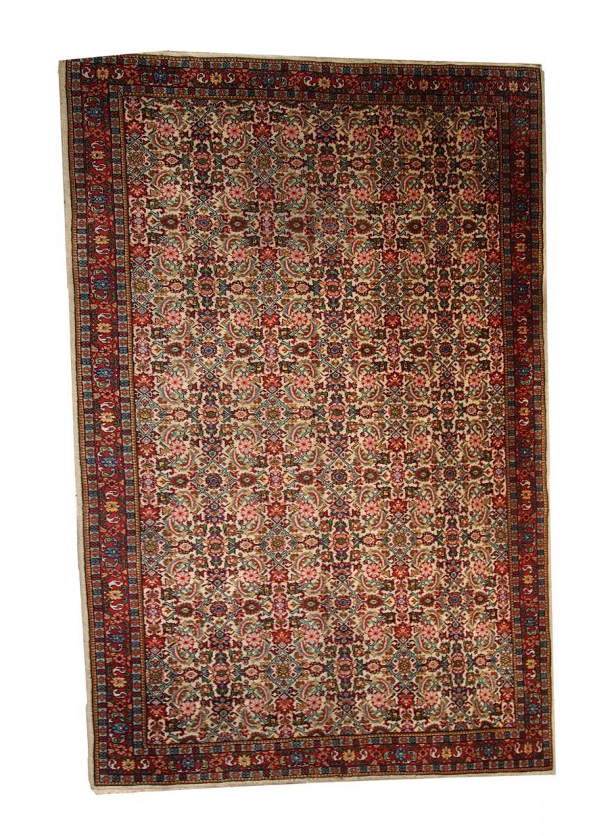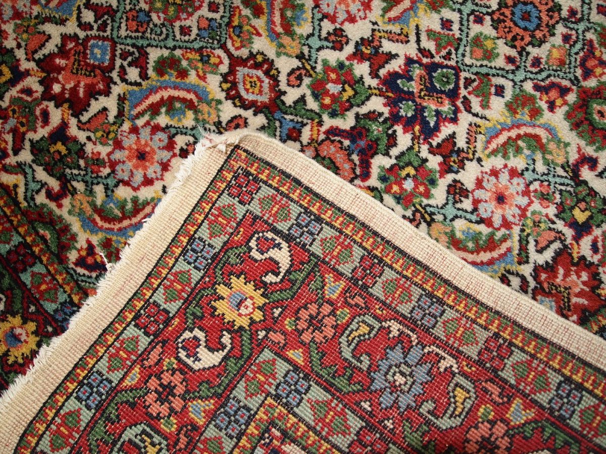 Antique Indo-Mahal rug in original good condition. The design on this rug is Persian but it was made in India. The rug is very colourful : red, beige, green, pink, yellow, azure, sky blue shades.